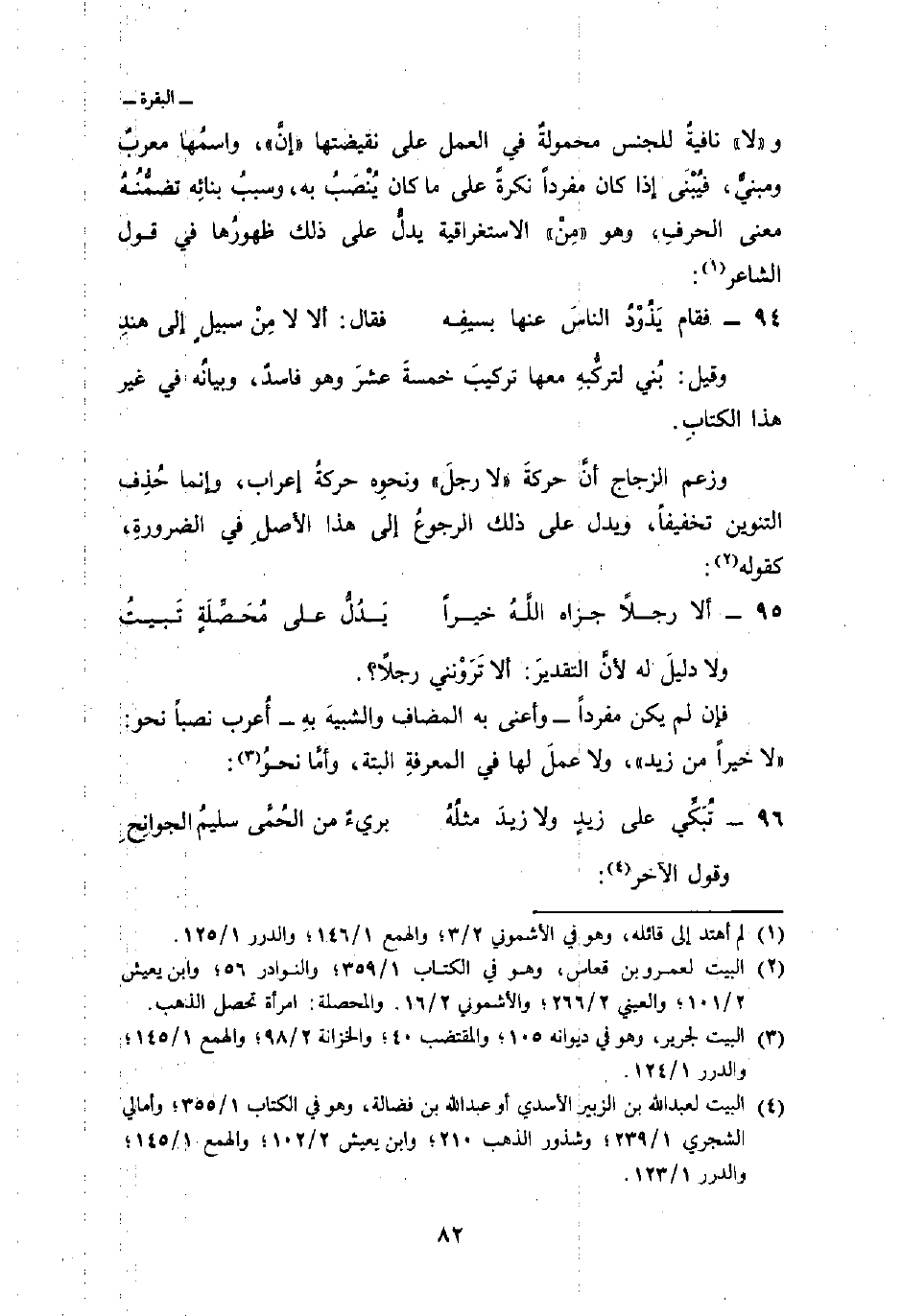 وزعم الزجاج أنَّ حركةَ «لا رجلَ» ونحوِه حركةُ إعراب، وإنما حُذِف التنوين تخفيفاً، ويدل على ذلك الرجوعُ إلى هذا الأصلِ في الضرورةِ، كقوله: