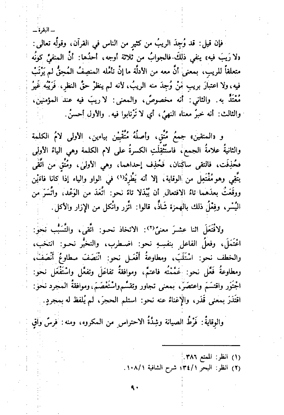 و «المتقين» جمعُ مُتَّقٍ، وأصلُهُ مُتَّقْيِيْن بياءين، الأولى لامُ الكلمة والثانيةُ علامةُ الجمع، فاستُثْقِلَتِ الكسرةُ على لام الكلمة وهي الياءُ الأولى فحُذِفَت، فالتقى ساكنان، فحُذِف إحداهما، وهي الأولى، ومتَّقٍ من اتَّقَى يتَّقِي وهو مُفْتَعِل من الوقاية، إلا أنه يَطَّرِدُ في الواو والياء إذا كانا فاءَيْن ووقَعَتْ بعدَهما تاءُ الافتعالِ أن يُبْدَلا تاءً نحو: اتَّعَدَ من الوَعْد، واتَّسَرَ من اليُسْر، وفِعْلُ ذلك بالهمزة شَاذٌّ، قالوا: اتَّزر واتَّكل من الإِزار والأكل.