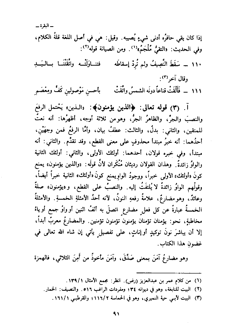 {الذين يُؤْمِنُونَ} : «الذين» يَحْتمل الرفعَ والنصبَ والجرَّ، والظاهرُ الجرُّ، وهو من ثلاثة أوجه، أظهرُها: أنه نعتٌ للمتقين، والثاني: بدلٌ، والثالث: عطفُ بيان، وأمَّا الرفعُ فمن وجهَيْنِ، أحدُهما: أنه خبرُ مبتدأ محذوفٍ على معنى القطع، وقد تقدَّم. والثاني: أنه مبتدأ، وفي خبره قولان: أحدهما: أولئك الأولى، والثاني: أولئك الثانية والواوُ زائدةٌ. وهذان القولان رديئان مُنْكَران لأنَّ قولَه: «والذين يؤمنون» يمنع كونَ «أولئك» الأولى خبراً، ووجودُ الواوِ يمنع كونَ «أولئك» الثانية خبراً أيضاً، وقولُهم الواوُ زائدةٌ لا يُلْتفَتْ إليه. والنصبُ على القطع، و «يؤمنون» صلةٌ وعائدٌ، وهو مضارعٌ، علامةُ رفعهِ النونُ، لأنه أحدُ الأمثلةِ الخمسةِ. والأمثلةُ الخمسةُ عبارةٌ عن كل فعلٍ مضارعٍ اتصلَ به ألفُ اثنين أو واوُ جمع أو ياءُ مخاطبةٍ، نحو: يؤمنان تؤمنان يؤمنون تؤمنون تؤمنين. والمضارعُ معربٌ أبداً، إلا أن يباشرَ نونَ توكيدٍ أو إناثٍ، على تفصيلٍ يأتي إن شاء الله تعالى في غضونِ هذا الكتاب.