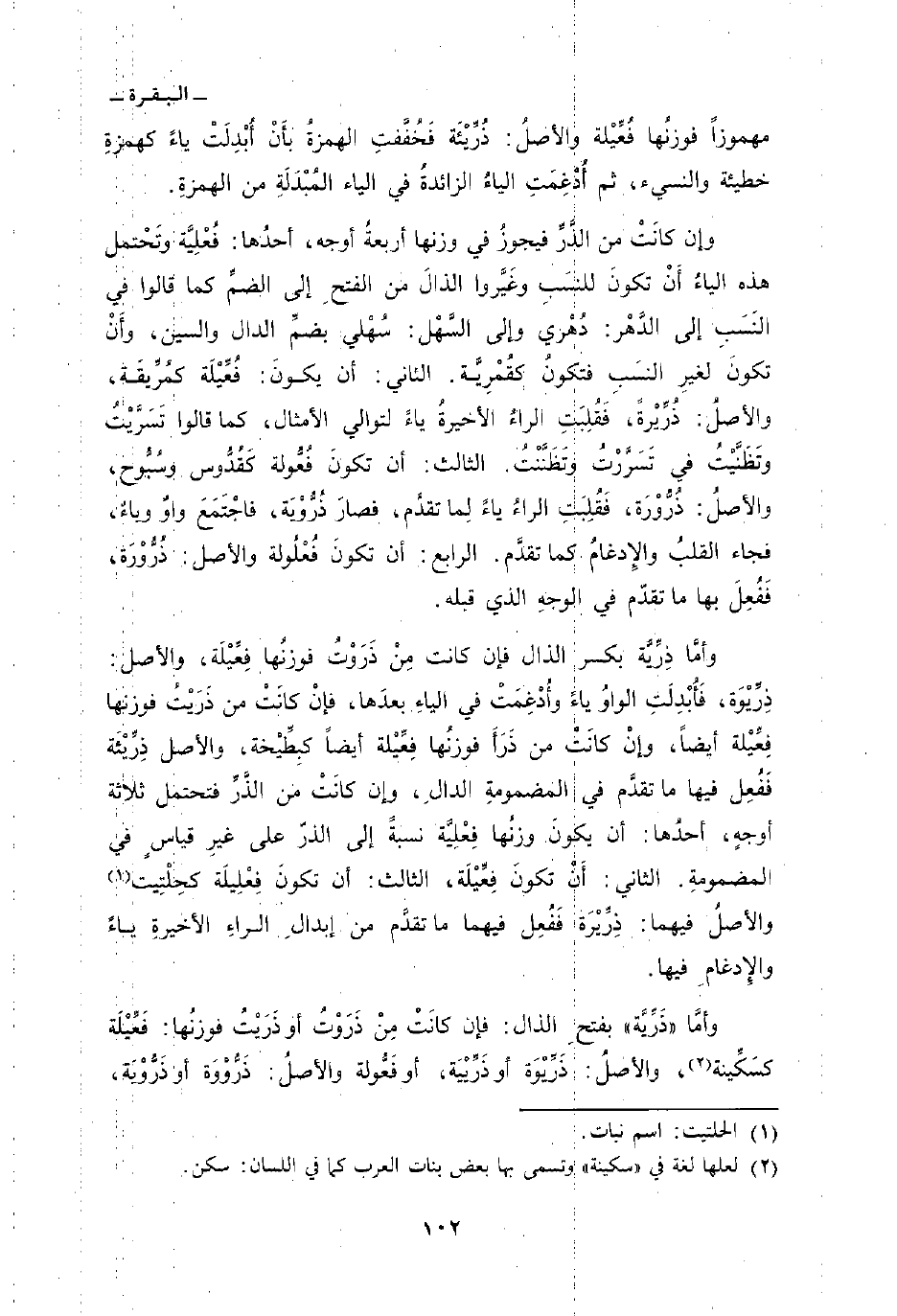 وأمَّا «ذَرِّيَّة» بفتحِ الذال: فإن كانَتْ مِنْ ذَرَوْتُ أو ذَرَيْتُ فوزنُها: فَعِّيْلَة كسَكِّينة، والأصلُ: ذَرِّيْوَة أو ذَرِّيْيَة، أو فَعُّولة والأصلُ: ذَرُّوْوَة أو ذَرُّوْيَة،