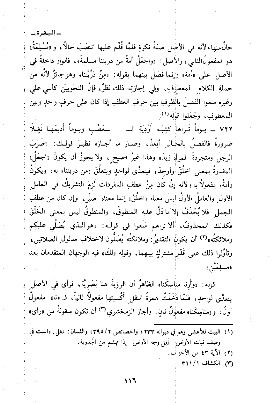ضرورةً فالفصلُ بالحالِ أبعدُ، وصار ما أجازه نظيرَ قولِك: «ضَرَبَ الرجلَ ومتجردةً المرأةَ زيدٌ» وهذا غيرُ فصيحٍ، ولا يجوزُ أن يكونَ «اجعَلْ» المقدرةُ بمعنى اخلُقْ وأوجِدْ، فيتعدَّى لواحدٍ ويتعلَّقَ «من ذريتنا» به، ويكونُ «أمةً» مفعولاً به؛ لأنه إنْ كان مِنْ عطفِ المفردات لَزِمَ التشريكُ في العاملِ الأولِ والعاملُ الأولُ ليس معناه «اخلُقْ» إنما معناه صيِّر، وإن كان من عطفِ الجملِ فلا يُحْذَفُ إلا ما دَلَّ عليه المنطوقُ، والمنطوقُ ليس بمعنى الخَلْقَ فكذلك المحذوفُ، ألا تراهم مَنَعوا في قولِه: {هُوَ الذي يُصَلِّي عَلَيْكُمْ وَمَلاَئِكَتُهُ} [الأحزاب: 43] أن يكونَ التقديرُ: وملائكتُه يُصَلُّون لاختلافِ مدلولِ الصلاتين، وتأوَّلوا ذلك على قَدْرٍ مشتركٍ بينهما، وقوله «لكَ» فيه الوجهان المتقدمان بعد «مسلِمَيْنِ» .