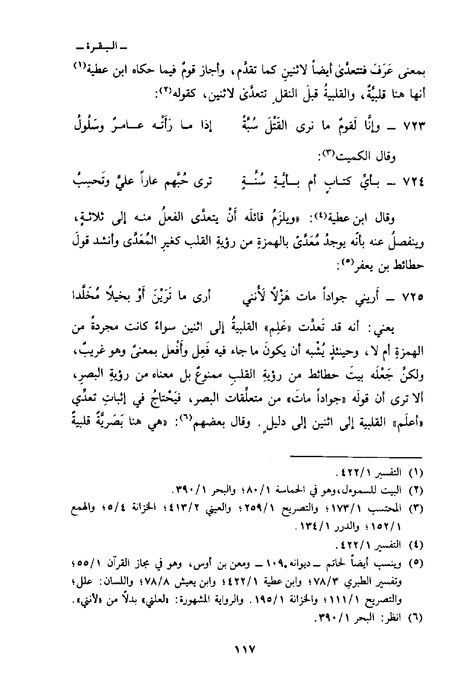وقال ابن عطية: «ويلزَمُ قائلَه أَنْ يتعدَّى الفعلُ منه إلى ثلاثةٍ: وينفصلُ عنه بأنّه يوجدُ مُعَدَّىً بالهمزةِ من رؤيةِ القلب كغيرِ المُعَدَّى وأنشد قولَ حطائط بن يعفر: