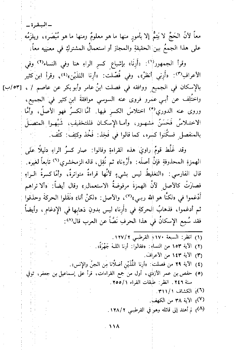 وقرأ الجمهور:» أَرِنَا «بإشباعِ كسرِ الراءِ هنا وفي النساء وفي الأعرافِ.» أَرِني أنظرْ «، وفي فُصّلت: {أَرِنَا الذين} [فصلت: 29] ، وقرأ ابن كثير بالإِسكان في الجميعِ ووافقه في فصلت ابنُ عامر وأبو بكر عن عاصم/، واختُلِف عن أبي عمرو فروى عنه السوسي موافقةَ ابنِ كثير في الجميع، وروى عنه الدوري اختلاسَ الكسرِ فيها. أمَّا الكسرُ فهو الأصلُ، وأمَّا الاختلاسُ فَحَسَنٌ مشهور، وأما الإِسكان فللتخفيفِ، شَبَّهوا المتصلَ بالمنفصلِ فسكَّنوا كسره، كما قالوا في فَخِذ: فَخْذ وكتِف: كتْف.