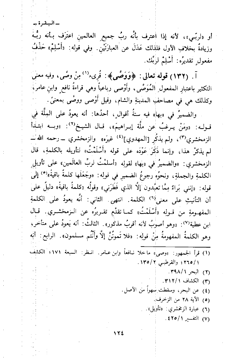 والضميرُ في «بها» فيه ستةُ أقوالٍ، أحدُها: أنه يعودُ على المِلَّة في قوله: {وَمَن يَرْغَبُ عَن مِّلَّةِ إِبْرَاهِيمَ} ، قال الشيخ: «وبه ابتدأ الزمخشري، ولم يذكُرِ [المهدوي] وغيرَه» والزمخشري - رحمه الله - لم يذكرْ هذا، وإنما ذَكَرَ عَوْدَه على قوله «أَسَلَمْتُ» لتأويله بالكلمةِ، قال الزمخشري: «والضميرُ في» بها «لقولِه {أَسْلَمْتُ لِرَبِّ العالمين} على تأويلِ الكلمةِ والجملةِ، ونحوُه رجوعُ الضميرِ في قولِه: {وَجَعَلَهَا كَلِمَةً بَاقِيَةً} [الزخرف: 28] إلى قوله: {إِنَّنِي بَرَآءٌ مِّمَّا تَعْبُدُونَ إِلاَّ الذي فَطَرَنِي} [الزخرف: 28] وقولُه» كلمةً باقيةً «دليلٌ على أن التأنيثِ على معنى الكلمة. انتهى. الثاني: أنَّه يعودُ على الكلمةِ المفهومةِ من قولِه» أَسْلَمْتُ «كما تقدَّم تقريرُه عن الزمخشري: قال ابن عطية:» وهو أصوبُ لأنه أقربُ مذكور «. الثالثُ: أنه يَعودُ على متأخر، وهو الكلمةُ المفهومةُ مِنْ قولِه: {فَلاَ تَمُوتُنَّ إَلاَّ وَأَنْتُم مُّسْلِمُونَ} . الرابع: أنه