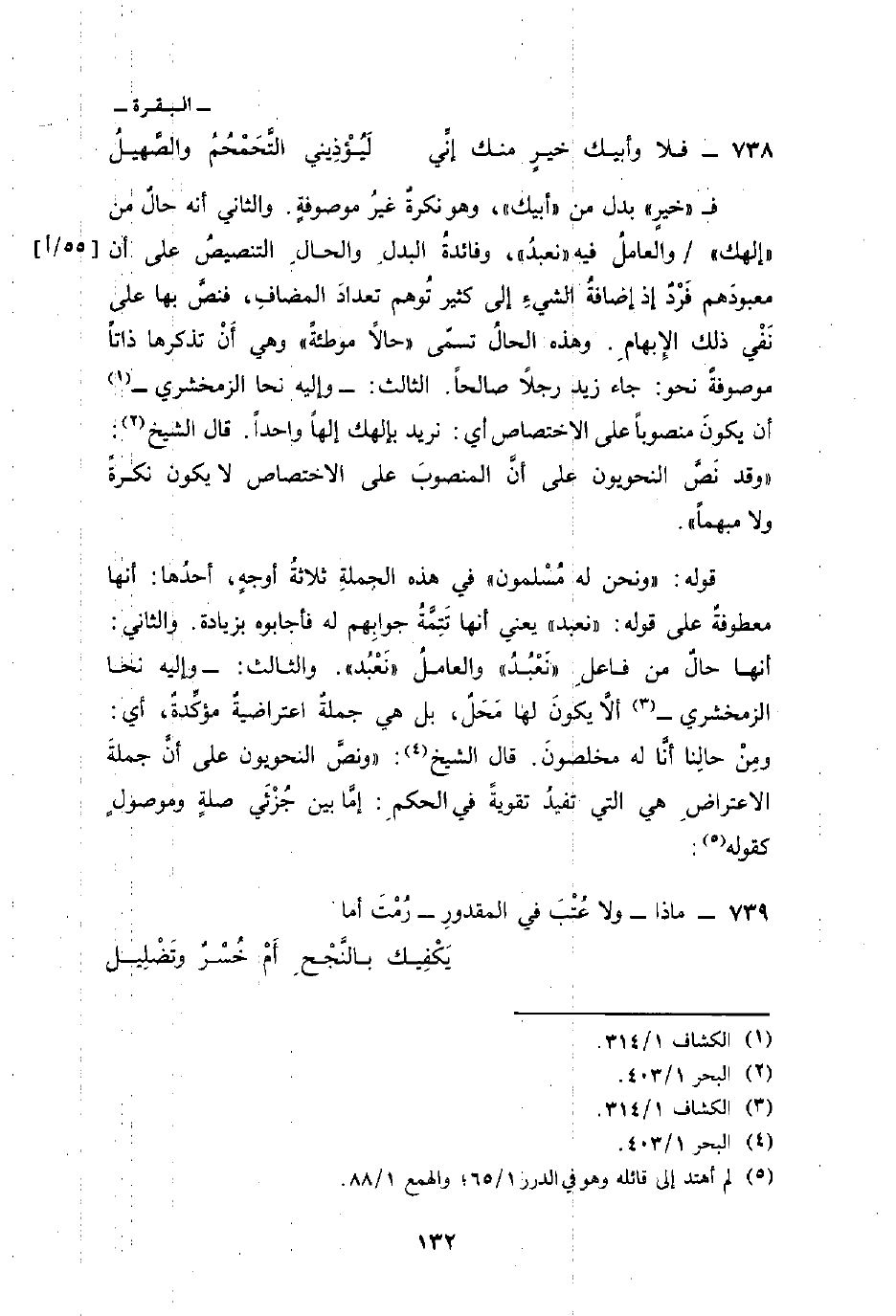 ف «خيرٍ» بدل من «أبيك» ، وهو نكرةٌ غيرُ موصوفةٍ. والثاني أنه حالٌ من «إلهك» / والعاملُ فيه «نعبدُ» ، وفائدةُ البدلِ والحالِ التنصيصُ على أن معبودَهم فَرْدٌ إذ إضافةُ الشيءِ إلى كثير تُوهم تعدادَ المضافِ، فنصَّ بها على نَفْي ذلك الإِبهامِ. وهذه الحالُ تسمّى «حالاً موطئةً» وهي أَنْ تذكرها ذاتاً موصوفةً نحو: جاء زيد رجلاً صالحاً. الثالث: - وإليه نحا الزمخشري - أن يكونَ منصوباً على الاختصاص أي: نريد بإلهك إلهاً واحداً. قال الشيخ: «وقد نَصَّ النحويون على أنَّ المنصوبَ على الاختصاص لا يكون نكرةً ولا مبهماً» .