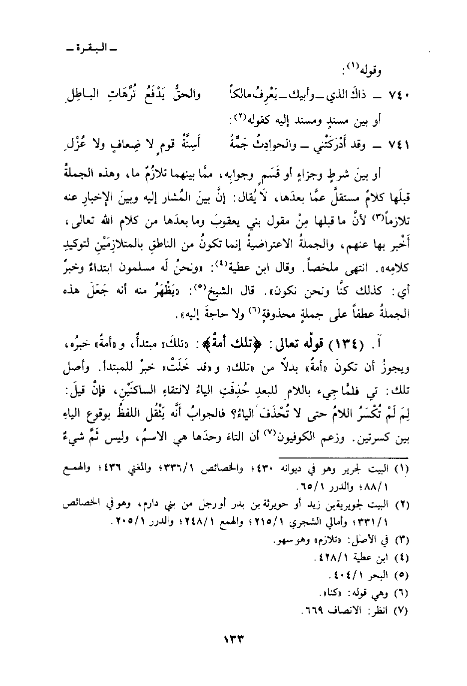 قولُه تعالى: {تِلْكَ أُمَّةٌ} : «تلكَ» مبتدأٌ، و «أمةٌ» خبرُه، ويجوزُ أن تكونَ «أمةٌ» بدلاً من «تلك» و «قد خَلَتْ» خبرٌ للمبتدأ.: وأصل تلك: تي فلمَّا جِيء باللامِ للبعدِ حُذِفَتِ الياءُ لالتقاءِ الساكنَيْنِ، فإنْ قيلَ: لِمَ لَمْ تُكْسَرُ اللامُ حتى لا تُحْذَفَ الياءُ؟ فالجوابُ أَنَّه يَثْقُل اللفظُ بوقوع الياءِ بين كسرتين. وزعم الكوفيون أن التاءَ وحدَها هي الاسمُ، وليس ثَمَّ شيءٌ