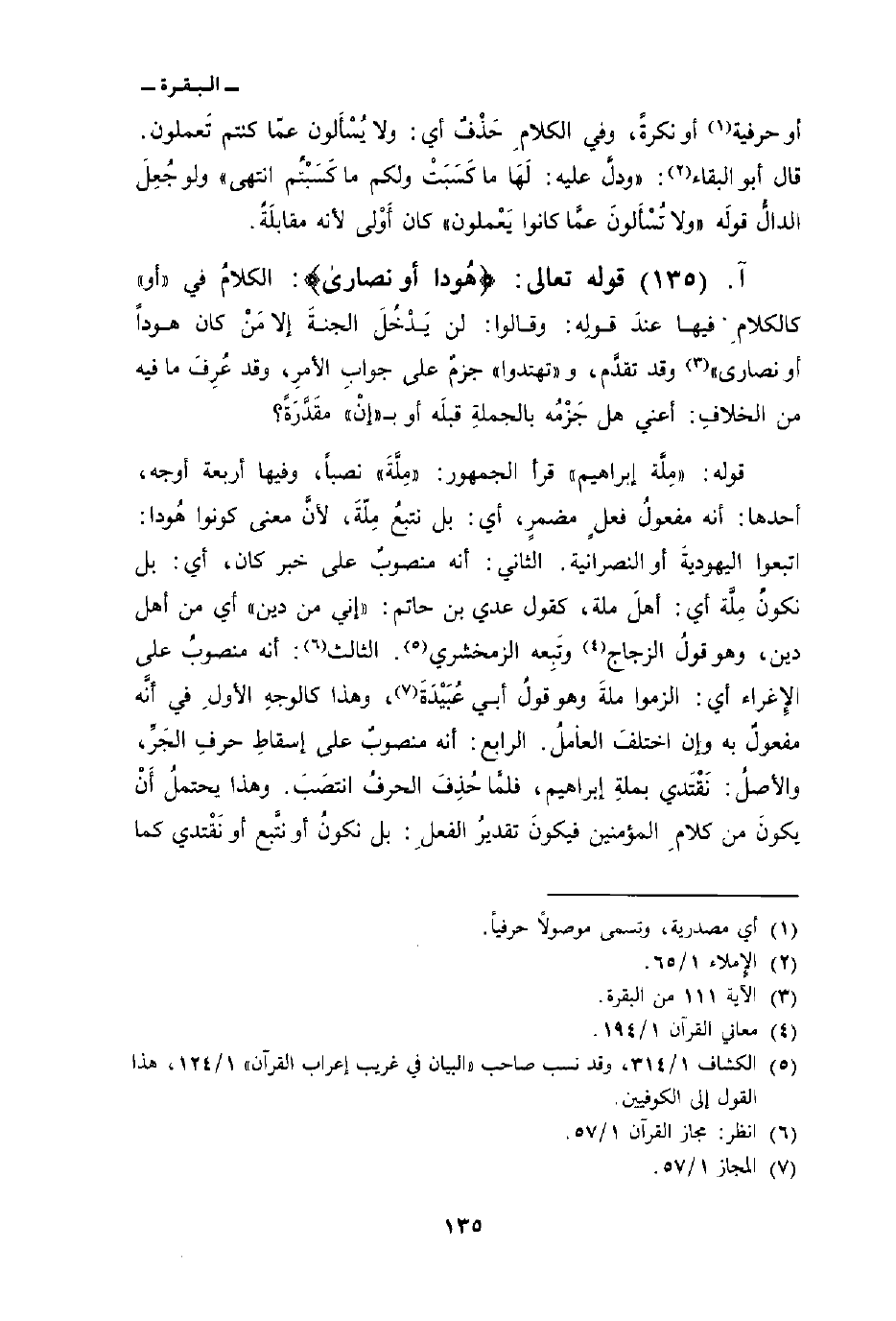 قوله: {مِلَّةَ إِبْرَاهِيمَ} قرأ الجمهور: «مِلَّةَ» نصباً، وفيها أربعة أوجه، أحدها: أنه مفعولُ فعلٍ مضمرٍ، أي: بل نتبعُ مِلّةَ، لأنَّ معنى كونوا هُوداً: اتبعوا اليهوديةَ أو النصرانية. الثاني: أنه منصوبٌ على خبر كان، أي: بل نكونُ مِلَّة أي: أهلَ ملة، كقول عدي بن حاتم: «إني من دين» أي من أهل دين، وهو قولُ الزجاج وتَبِعه الزمخشري. الثالث: أنه منصوبُ على الإِغراء أي: الزموا ملةَ وهو قولُ أبي عُبَيْدَةَ، وهذا كالوجهِ الأولِ في أنَّه مفعولٌ به وإن اختلفَ العاملُ. الرابع: أنه منصوبٌ على إسقاطِ حرفِ الجَرِّ، والأصلُ: نَقْتَدي بملةِ إبراهيم، فلمَّا حُذِفَ الحرفُ انتصَبَ، وهذا يحتملُ أَنْ يكونَ من كلامِ المؤمنين فيكونَ تقديرُ الفعلِ: بل نكونُ أو نتَّبع أو نَقْتدي كما