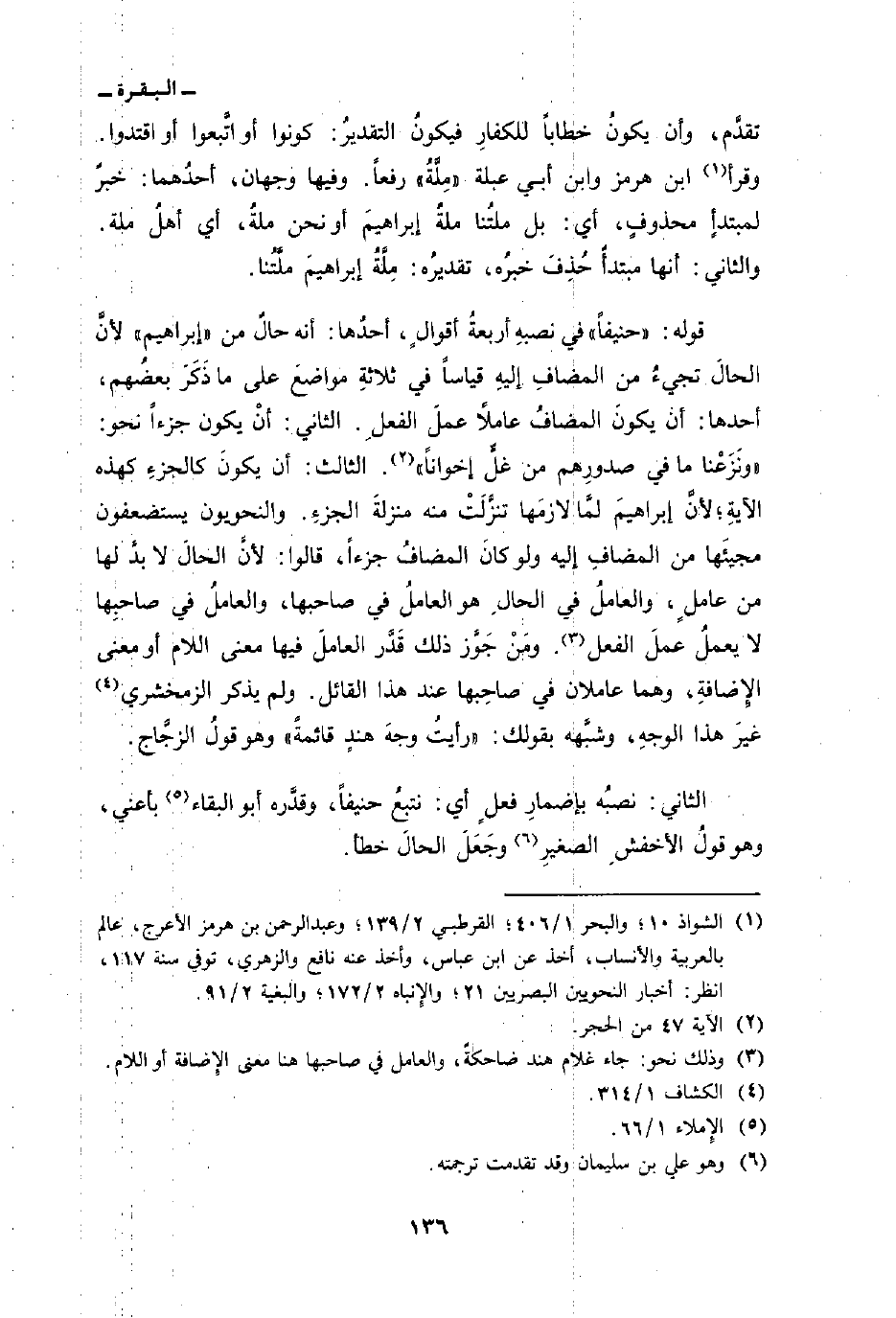 تقدَّم، وأن يكونُ خطاباً للكفارِ فيكونُ التقديرُ: كونوا أو اتَّبعوا او اقتدوا. وقرأ ابن هرمز وابن أبي عبلة «مِلَّةُ» رفعاً. وفيها وجهان: أحدُهما: خبرٌ لمبتدأٍ محذوفٍ، أي: بل ملتُنا ملةُ إبراهيمَ أو نحن ملةُ، أي أهلُ ملة.