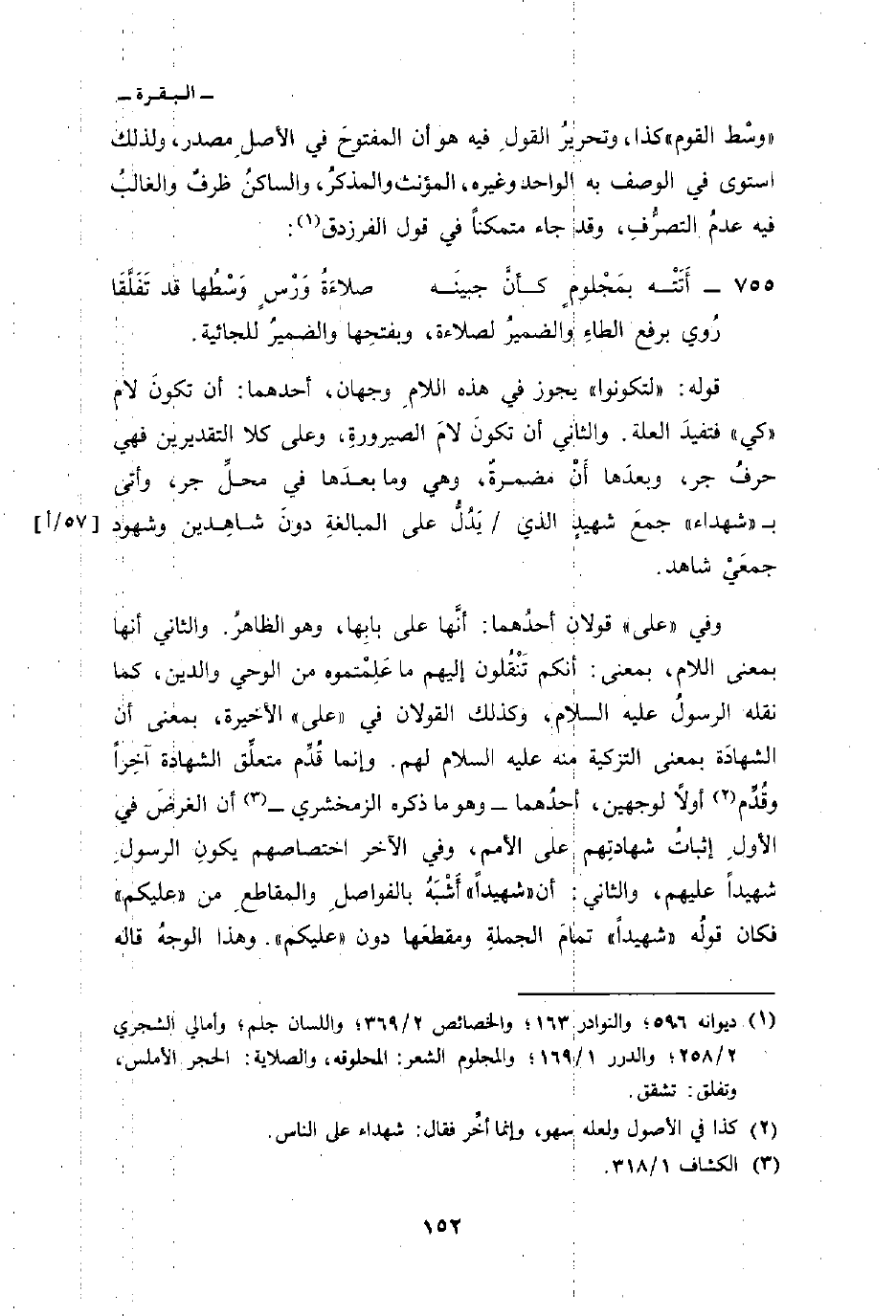 قوله:» لتكونوا «يجوز في هذه اللامِ وجهان، أحدهما: أن تكونَ لام» كي «فتفيدَ العلة. والثاني أن تكونَ لامَ الصيرورةِ، وعلى كلا التقديرين فهي حرفُ جر، وبعدَها أَنْ مضمرةٌ، وهي وما بعدَها في محلِّ جر، وأتى ب» شهداء «جمعَ شهيدٍ الذي/ يَدُلُّ على المبالغةِ دونَ شاهِدين وشهود جمعَيْ شاهد.