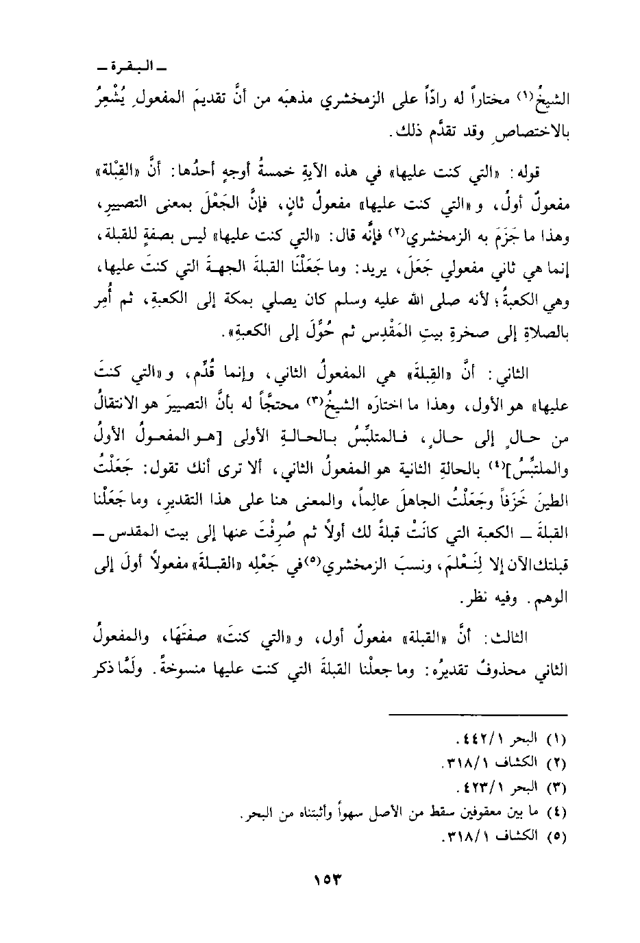 قوله: {التي كُنتَ عَلَيْهَآ} في هذه الآيةِ خمسةُ أوجهٍ أحدُها: أنَّ «القِبلْة» مفعولٌ أولُ، و {التي كُنتَ عَلَيْهَآ} مفعولٌ ثانٍ، فإنَّ الجَعْلَ بمعنى التصييرِ، وهذا ما جَزَمَ به الزمخشري فإنَّه قال: {التي كُنتَ عَلَيْهَآ} ليس بصفةٍ للقبلة، إنما هي ثاني مفعولي جَعَلَ، يريد: وما جَعَلْنَا القبلةَ الجهةَ التي كنتَ عليها، وهي الكعبةُ؛ لأنه صَلَّى اللهُ عَلَيْهِ وَسَلَّمَ كان يصلي بمكة إلى الكعبةِ، ثم أُمِر بالصلاةِ إلى صخرةِ بيتِ المَقْدِس ثم حُوِّلَ إلى الكعبةِ «.