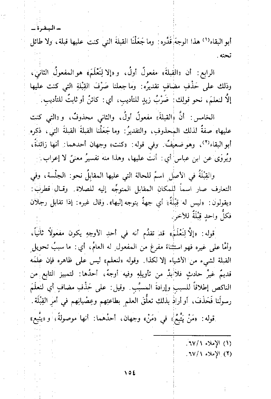 الرابع: أن» القبلةَ «مفعولٌ أولُ، و» إلا لِنَعْلَمَ «هو المفعولُ الثاني، وذلك على حَذْفِ مضافٍ تقديرُه: وما جعلنا صَرْفَ القِبْلةِ التي كنت عليها إلاَّ لنعلمَ، نحو قولِك: ضَرْبُ زيدٍ للتأديبِ، أي: كائنٌ أو ثابتٌ للتأديبِ.