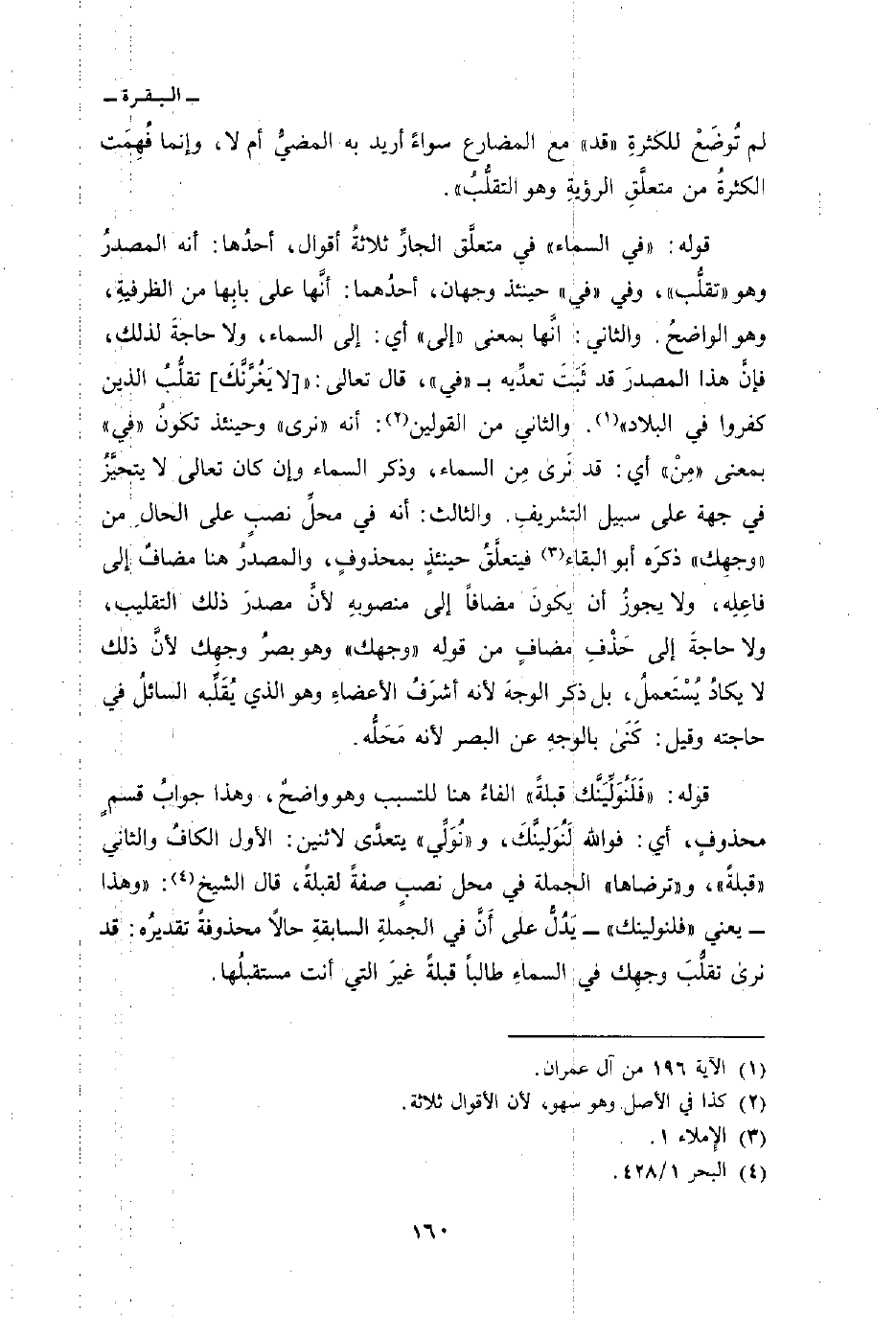 قوله: {فِي السمآء} : في متعلَّق الجارِّ ثلاثةُ أقوال، أحدُها: أنه المصدرُ وهو» تقلُّب «، وفي» في «حينئذ وجهان، أحدُهما: أنَّها على بابِها الظرفية وهو الواضحُ. والثاني: أنَّها بمعنى» إلى «أي: إلى السماء، ولا حاجةَ لذلك، فإنَّ هذا المصدرَ قد ثَبَتَ تعدّيه ب» في «، قال تعالى: { [لاَ يَغُرَّنَّكَ] تَقَلُّبُ الذين كَفَرُواْ فِي البلاد} [آل عمران: 196] . والثاني من القولين: أنه» نرى «وحينئذ تكونُ» في «بمعنى» مِنْ «أي: قد نَرى مِن السماء، وذكر السماء وإن كان تعالى لا يتحيَّزُ في جهة على سبيل التشريفِ. والثالث: أنه في محلِّ نصبٍ على الحالِ من» وجهِك «ذكرَه أبو البقاء فيتعلَّقُ حينئذٍ بمحذوفٍ، والمصدرُ هنا مضافٌ إلى فاعِلِه، ولا يجوزُ أن يكونَ مضافاً إلى منصوبهِ لأنَّ مصدرَ ذلك التقليب، ولا حاجةَ إلى حَذْفِ مضافٍ من قولِه» وجهك «وهو بصرُ وجهِك لأنَّ ذلك لا يكادُ يُسْتَعملُ، بل ذكر الوجهَ لأنه أشرَفُ الأعضاءِ وهو الذي يُقَلْبه السائلُ في حاجته وقيل: كَنَى بالوجهِ عن البصر لأنه مَحَلُّه.