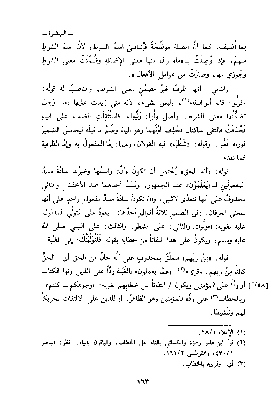 وفي الضميرِ ثلاثةُ أقوالٍ أحدُها: يعودُ على التوليِّ المدلولِ عليه بقولِه: «فولُّوا» . والثاني: على الشطر. والثالث: على النبي صَلَّى اللهُ عَلَيْهِ وَسَلَّمَ، ويكونُ على هذا التفاتاً من خطابه بقوله «فَلَنُوَلِّينَّكَ» إلى الغَيْبة.