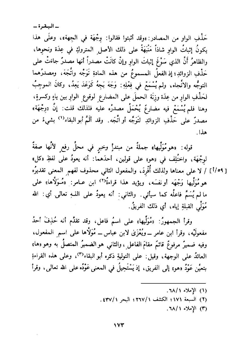 حَذْفِ الواو من المصادر:» وقد أثبتوا فقالوا: وِجْهَة في الجِهة «، وعلَى هذا يكونُ إثباتُ الواوِ شاذاً مَنْبَهَةً على ذلك الأصلِ المتروكِ في عِدَة ونحوِها، والظاهرُ أَنَّ الذي سَوَّغَ إثباتَ الواوِ وإنْ كانَتْ مصدراً أنها مصدرٌ جاءَتْ على حَذْفِ الزوائدِ؛ إذ الفعلُ المسموعُ من هذه المادةِ تَوَجَّه واتَّجَهَ، ومصدرُهما التوجُّه والاتِّجاه، ولم يُسْمَعْ في فِعْلِه: وَجَهَ يَجِهُ كَوَعَدَ يَعِدُ، وكانَ الموجِبَ لحَذْفِ الواوِ من عِدَة وزِنَة الحملَ على المضارعِ لوقوعِ الواوِ بين ياءٍ وكسرةٍ، وهنا فلم يُسْمَعْ فيه مضارعٌ يُحْمَلُ مصدرُه عليه فلذلك قلت: إنَّ» وِجْهَة «مصدرٌ على حَذْفِ الزوائدِ لَتَوَجَّه أو اتَّجَه. وقد ألَمَّ أبو البقاء بشيءً من هذا.