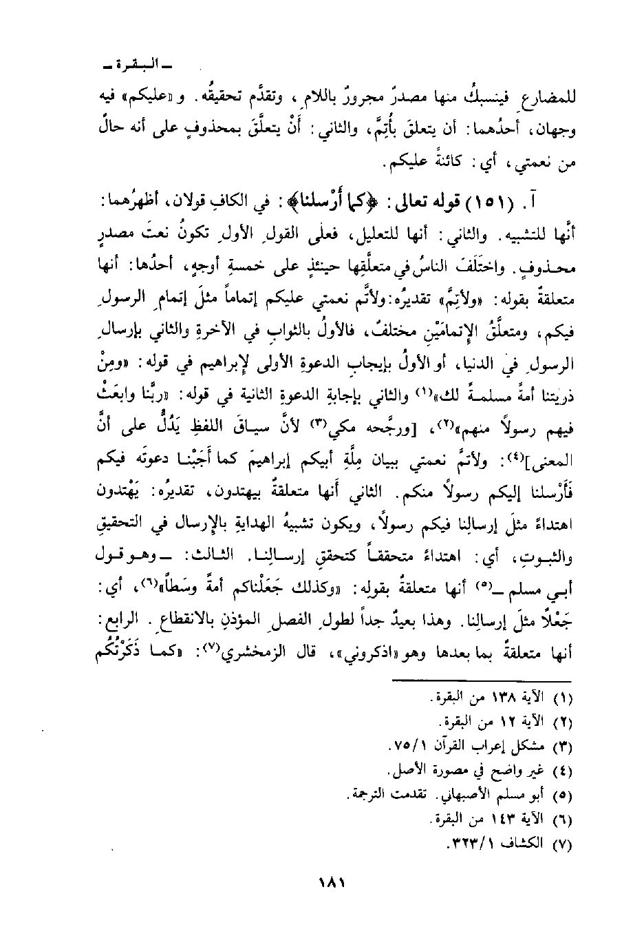 قوله تعالى: {كَمَآ أَرْسَلْنَا} : في الكافِ قولان، أظهرُهما: أنَّها للتشبيه. والثاني: أنها للتعليل، فعلى القولِ الأولِ تكونُ نعتَ مصدرٍ محذوفٍ. واختَلَفَ الناسُ في متعلَّقِها حينئذٍ على خمسةِ أوجهٍ، أحدُها: أنها متعلقةٌ بقوله: «ولأتِمَّ» تقديرُه: ولأتَّم نعمتي عليكم إتماماً مثلَ إتمامِ الرسولِ فيكم، ومتعلَّقُ الإِتمامَيْنِ مختلفٌ، فالأولُ بالثوابِ في الآخرةِ والثاني بإرسالِ الرسولِ في الدنيا، أو الأولُ بإيجابِ الدعوةِ الأولى لإِبراهيم في قوله: {وَمِن ذُرِّيَّتِنَآ أُمَّةً مُّسْلِمَةً لَّكَ} [البقرة: 138] والثاني بإجابةِ الدعوةِ الثانية في قوله: {رَبَّنَا وابعث فِيهِمْ رَسُولاً مِّنْهُمْ} [البقرة: 12] ، [ورجَّحه مكي لأنَّ سياقَ اللفظِ يَدُلُّ على أنَّ المعنى] : ولأتمَّ نعمتي ببيان مِلَّةِ أبيكم إبراهيمَ كما أَجَبْنا دعوتَه فيكم فَأَرْسلنا إليكم رسولاً منكم. الثاني أَنها متعلقةٌ بيهتدون، تقديرُه: يَهْتدون اهتداءً مثلَ إرسالِنا فيكم رسولاً، ويكون تشبيهُ الهدايةِ بالإِرسال في التحقيق والثبوتِ، أي: اهتداءً متحققاً كتحققِ إرسالنا. الثالث: - وهو قول أبي مسلم - أنها متعلقةٌ بقولِه: {وَكَذَلِكَ جَعَلْنَاكُمْ أُمَّةً وَسَطاً} [البقرة: 143] ، أي: جَعْلاً مثلَ إرسالِنا. وهذا بعيدٌ جداً لطولِ الفصلِ المؤذنِ بالانقطاعِ. الرابع: أنها متعلقةٌ بما بعدها وهو «اذكروني» ، قال الزمخشري: «كما ذَكَرْتُكُم