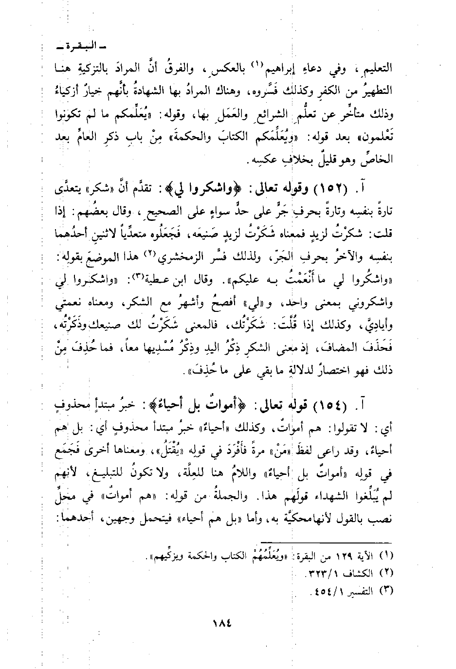 قوله تعالى: {أَمْوَاتٌ بَلْ أَحْيَاءٌ} : خبرُ مبتدأٍ محذوفٍ أي: لا تقولوا: هم أمواتٌ، وكذلك «أحياءٌ» خبرُ مبتدأ محذوفٍ أي: بل هم أحياءٌ، وقد راعى لفظَ «مَنْ» مرةً فأَفْرَدَ في قولِه «يُقْتَلُ» ، ومعناها أخرى فَجَمَع في قولِه {أَمْوَاتٌ بَلْ أَحْيَاءٌ} واللامُ هنا للعِلَّة، ولا تكونُ للتبليغ، لأنهم لم يُبَلِّغوا الشهداء قولَهم هذا. والجملةُ من قولِه: «هم أمواتٌ» في محلِّ نصب بالقول لأنها محكيَّة به، وأما {بَلْ هُمْ أَحْيَاءٌ} فيتحمل وجهين، أحدهما