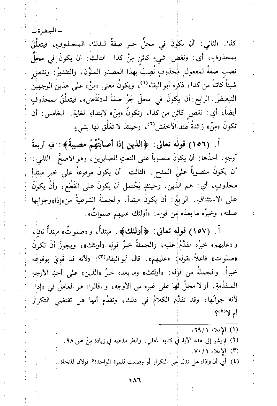 قوله تعالى: {الذين إِذَآ أَصَابَتْهُم مُّصِيبَةٌ} : فيه أربعةُ أوجهٍ، أحدُها: أن يكونَ منصوباً على النعتِ للصابرين، وهو الأصحُّ. الثاني: أن يكونَ منصوباً على المدحِ. الثالث: أن يكونَ مرفوعاً على خبرِ مبتدأٍ محذوفٍ، أي: هم الذين، وحينئذٍ يَحْتمل أن يكونَ على القَطْع، وأَنْ يكونَ على الاستئنافِ. الرابعُ: أن يكونَ مبتدأ، والجملةُ الشرطيةُ من «إذا» وجوابِها صلته، وخبرهُ ما بعدَه من قولِه: {أولئك عَلَيْهِمْ صَلَوَاتٌ} .