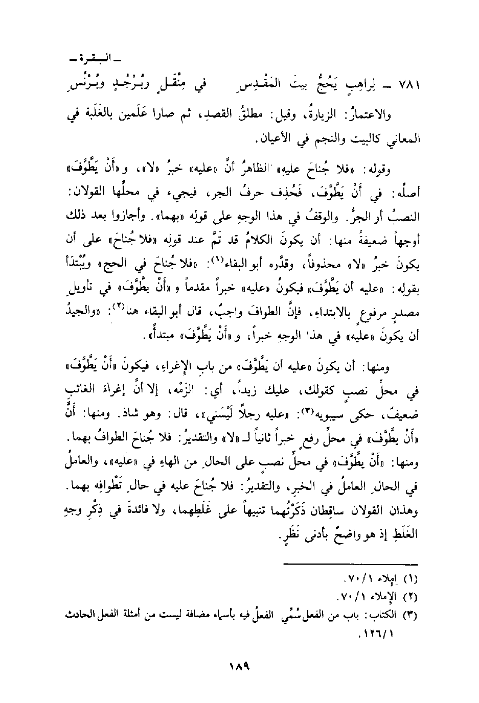 ومنها: أَنَّ «أَنْ يطَّوَّفَ» في محلِّ رفعٍ خبراً ثانياً ل «لا» والتقديرُ: فلا جُناحَ الطوافُ بهما. ومنها: «أَنْ يطَّوَّفَ» في محلِّ نصبٍ على الحالِ من الهاءِ في «عليه» ، والعاملُ في الحالِ العاملُ في الخبرِ، والتقديرُ: فلا جُناحَ عليه في حالِ تَطْوافِه بهما. وهذان القولان ساقِطان ذَكَرْتُهما تنبيهاً على غَلَطِهما، ولا فائدةٌ في ذِكْرِ وجهِ الغَلَطِ إذا هو واضحٌ بأدنى نَظَرٍ.