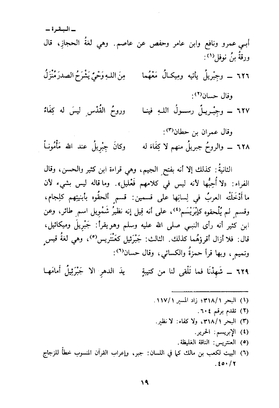 الثانيةُ: كذلك إلا أنه بفتحِ الجيم، وهي قراءة ابن كثير والحسن، وقال الفراء: «لا أُحِبُّها لأنه ليس في كلامهم فَعْليل» . وما قاله ليس بشيء لأن ما أَدْخَلَتْه العربُ في لِسانِها على قسمين: قسمٍ ألحقُوه بأبنيتِهم كلِجام، وقسمٍ لم يُلْحقوه كإبْرَيْسَم، على أنه قِيل إنه نظيرُ شَمْوِيل اسمِ طائر، وعن ابن كثير أنه رأى النبى صَلَّى اللهُ عَلَيْهِ وَسَلَّمَ وهو يقرأ: جَبْريلَ وميكائيل، قال: فلا أزال أقرؤهُما كذلك. الثالث: جَبْرَئيل كعَنْتَريس، وهي لغةُ قيسٍ وتميمٍ، وبها قرأ حمزةُ والكسائي، وقال حسان: