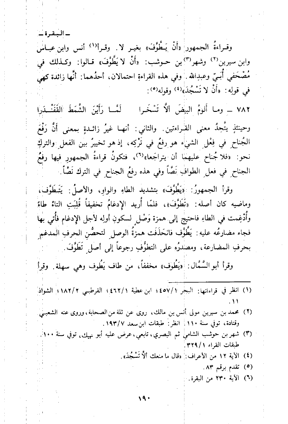 وقراءةُ الجمهور «أَنْ يَطَّوَّفَ» بغير لا. وقرأ أنس وابن عباس وابن سيرين وشهر بن حوشب: «أَنْ لا يَطَّوَّفَ» قالوا: وكذلك في مُصْحَفي أُبَيّ وعبدِ الله. وفي هذه القراءةِ احتمالان، أحدُهما: أنَّها زائدة كهي في قولِه: {أَلاَّ تَسْجُدَ} [الأعراف: 12] وقوله: