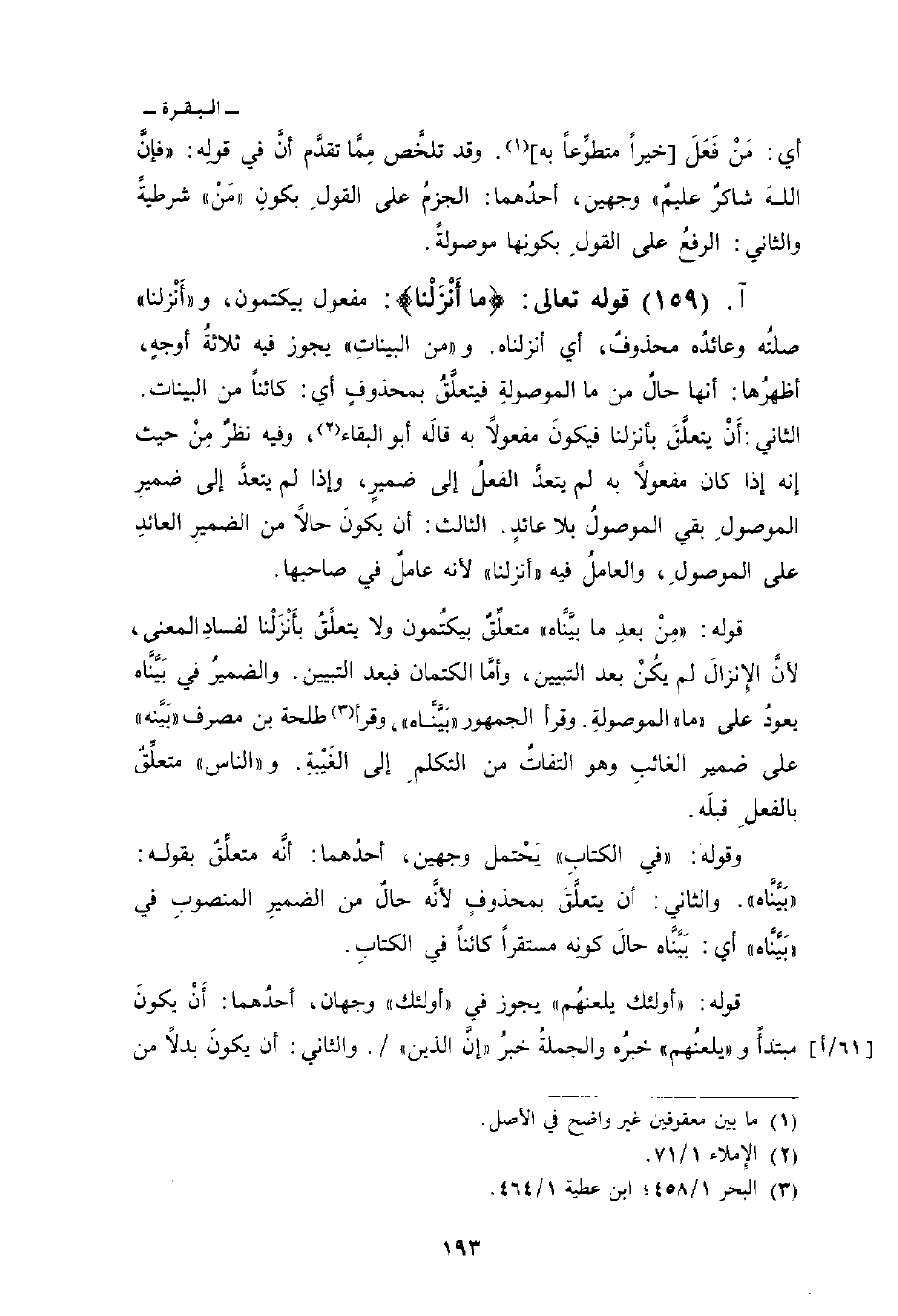 قوله تعالى: {مَآ أَنزَلْنَا} : مفعول بيكتمون، و «أَنْزلنا» صلتُه وعائدُه محذوفٌ، أي أنزلناه. و «من البيناتِ» يجوز فيه ثلاثةُ أوجهٍ، أظهرُها: أنها حالٌ من ما الموصولةِ فيتعلَّقُ بمحذوفٍ أي: كائناً من البينات. الثاني: أَنْ يتعلَّق بأنزلنا فيكونَ مفعولاً به قالَه أبو البقاء، وفيه نظرٌ مِنْ حيث إنه إذا كان مفعولاً به لم يتعدَّ الفعلُ إلى ضميرٍ، وإذا لم يتعدَّ إلى ضميرِ الموصولِ بقي الموصولُ بلا عائدٍ. الثالث: أن يكونَ حالاً من الضميرِ العائدِ على الموصولِ، والعاملُ فيه «أنزلنا» لأنه عاملٌ في صاحبها.