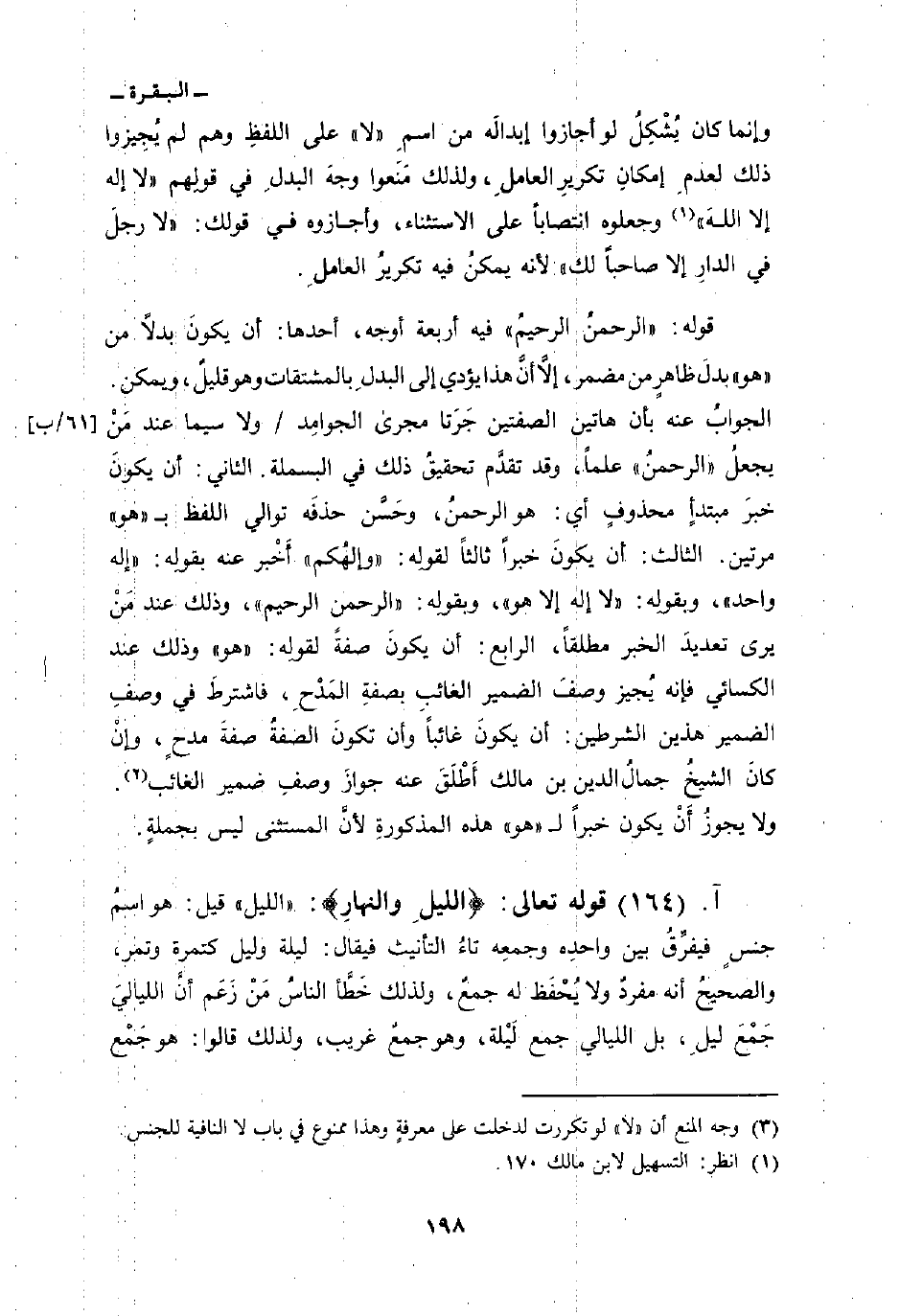الجوابُ عنه بأن هاتين الصفتين جَرَتا مجرى الجوامِد/ ولا سيما عند مَنْ يجعلُ «الرحمنُ» علماً، وقد تقدَّم تحقيقُ ذلك في البسملة. الثاني: أن يكونَ خبرَ مبتدأٍ محذوفٍ أي: هو الرحمنُ، وحَسَّن حذفَه توالي اللفظ ب «هو» مرتين. الثالث: أن يكونَ خبراً ثالثاً لقولِه: «وإلهُكم» أَخْبر عنه بقولِه: «إله واحد» ، وبقولِه: «لا إله إلا هو» ، وبقولِه: «الرحمن الرحيم» ، وذلك عند مَنْ يرى تعديدَ الخبر مطلقاً، الرابع: أن يكونَ صفةً لقولِه: «هو» وذلك عند الكسائي فإنه يُجيز وصفَ الضمير الغائبِ بصفةِ المَدْحِ، فاشترطَ في وصفِ الضمير هذين الشرطين: أن يكونَ غائباً وأن تكونَ الصفةُ صفةَ مدحٍ، وإنْ كانَ الشيخُ جمالُ الدين بن مالك أَطْلَقَ عنه جوازَ وصفِ ضمير الغائب. ولا يجوزُ أَنْ يكون خبراً ل «هو» هذه المذكورةِ لأنَّ المستثنى ليس بجملةٍ.