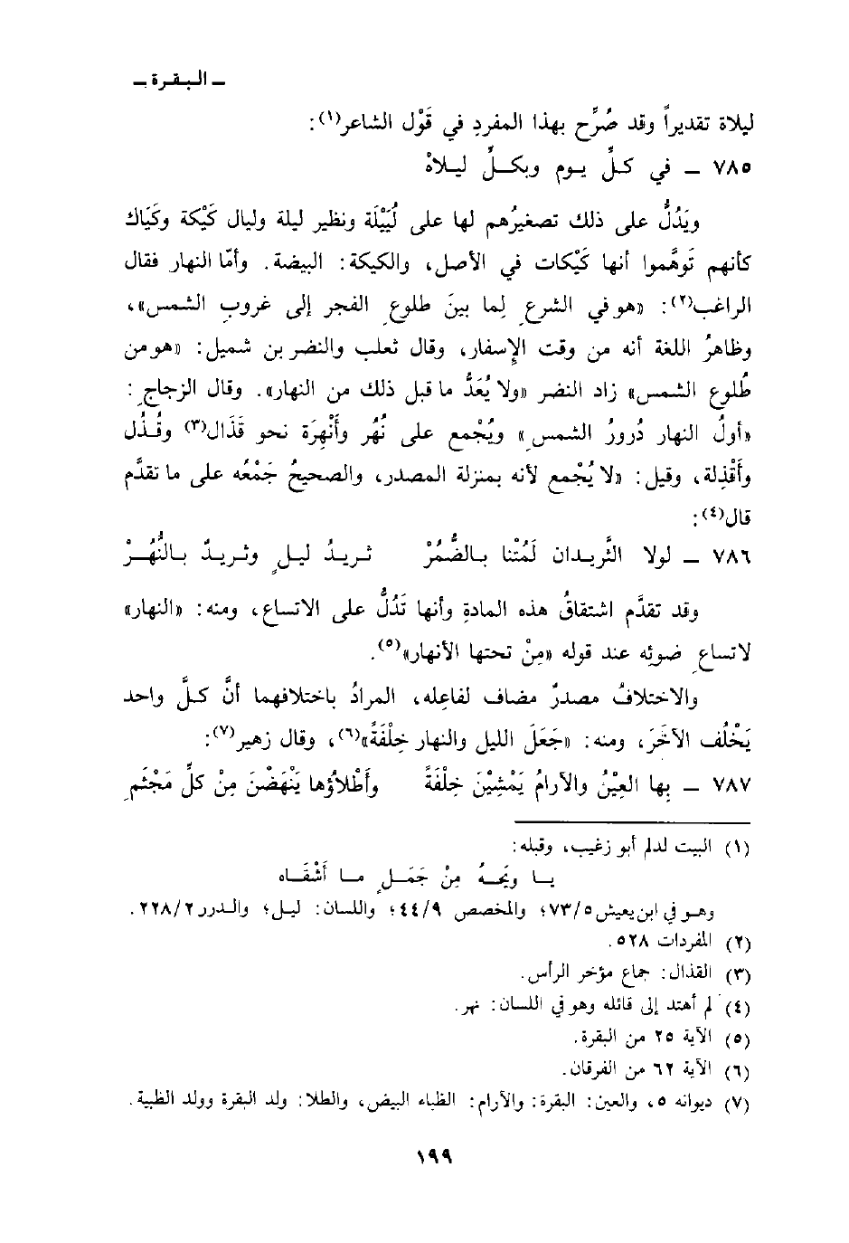 785 - في كلِّ يوم وبكلِّ ليلاهْ ... ويَدُلُّ على ذلك تصغيرُهم لها على لُيَيْلَة ونظير ليلة وليال كَيْكة وكَيَاك كأنهم تَوهَّموا أنها كَيْكات في الأصل، والكيكة: البيضة. وأمّا النهار فقال الراغب: «هو في الشرعِ لِما بينَ طلوعِ الفجر إلى غروبِ الشمس» ، وظاهرُ اللغة أنه من وقت الإِسفار، وقال ثعلب والنضر بن شميل: «هو من طُلوع الشمس» زاد النضر «ولا يُعَدُّ من قبل ذلك من النهار» . وقال الزجاجِ: «أولُ النهار دُرورُ الشمسِ» ويُجْمع على نُهُر وأَنْهِرَة نحو قَذَال وقُذُل وأَقْذِلة، وقيل: «لا يُجْمع لأنه بمنزلة المصدر، والصحيحُ جَمْعُه على ما تقدَّم قال: