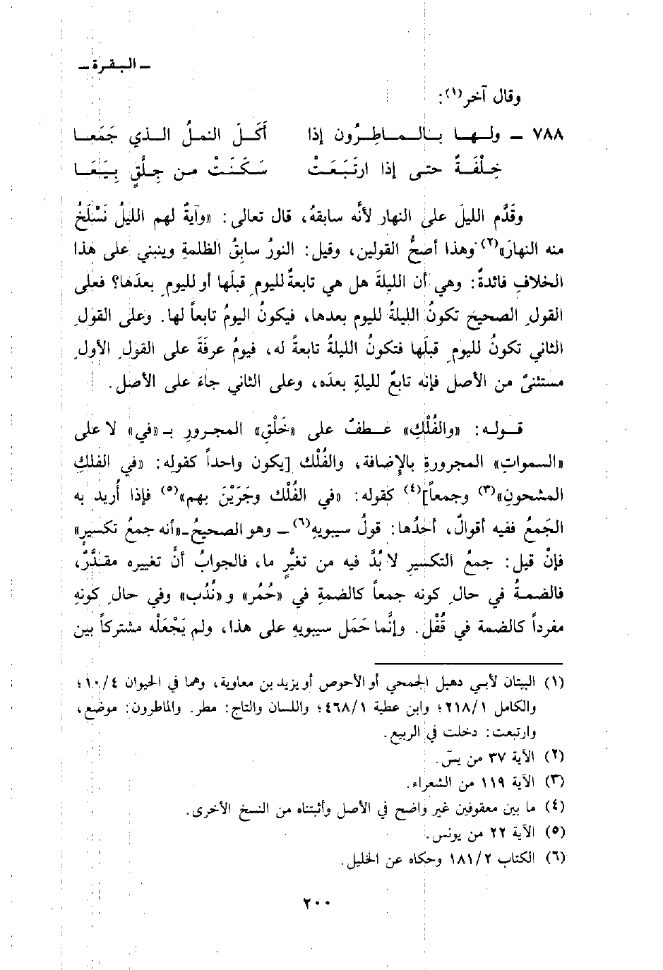 قوله: {والفلك} عطفٌ على» خَلْقِ «المجرورِ ب» في «لا على» السماواتِ «المجرورةِ بالإِضافة، والفُلْك [يكون واحداً كقولِه: {فِي الفلك المشحون} [الشعراء: 119] وجمعاً] كقوله: {فِي الفلك وَجَرَيْنَ بِهِم} [يونس: 22] فإذا أُريد به، الجَمعُ ففيه أقوالٌ، أحدُها: قولُ سيبويهِ - وهو الصحيحُ -» أنه جمعُ تكسير «فإنْ قيل: جمعُ التكسيرِ لا بُدَّ فيه من تغيُّرٍ ما، فالجوابُ أنَّ تغييره مقدَّرٌ، فالضمةُ في حالِ كونه جمعاً كالضمةِ في» حُمُر «و» نُدُب «وفي حالِ كونهِ مفرداً كالضمة في قُفْل.