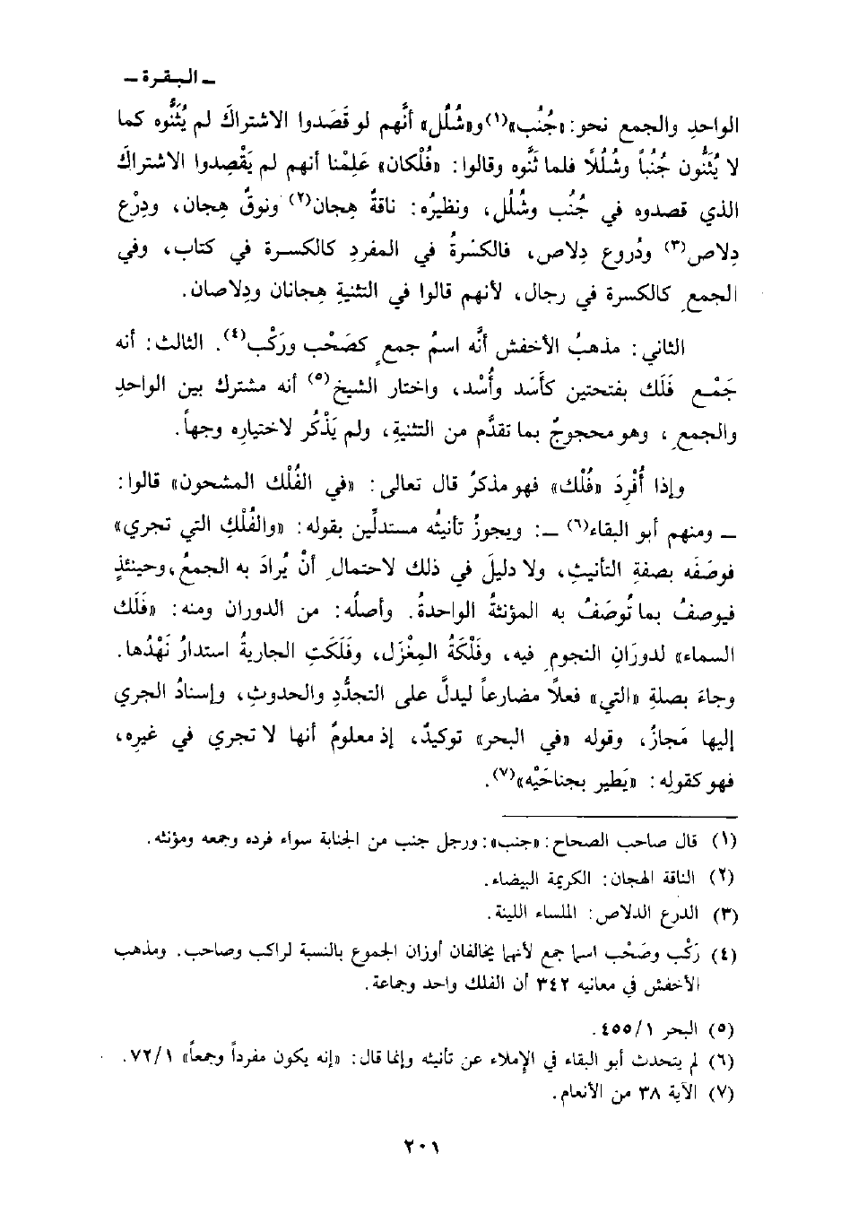 الواحدِ والجمع نحو: «جُنُب» و «شُلُل» أنَّهم لو قَصَدوا الاشتراكَ لم يُثَنُّوه كما لا يُثَنُّون جُنُباً وشُلُلاً فلما ثَنَّوه وقالوا: «فُلْكان» عَلِمْنا أنهم لم يَقْصِدوا الاشتراكَ الذي قصدوه في جُنُب وشُلُل ونظيرُه: ناقةٌ هِجان ونوقٌ هِجان، ودِرْع دِلاص ودُروع دِلاص، فالكسَرةُ في المفردِ كالكسرة في كتاب، وفي الجمعِ كالكسرة في رجال، لأنهم قالوا في التثنيةِ هِجانان ودِلاصان.
