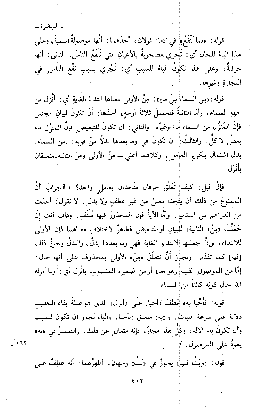 فإنْ قيل: كيف تَعَلَّق حرفان متَّحدان بعاملٍ واحد؟ فالجوابُ أنَّ الممنوعَ من ذلك أن يتَّحِدا معنىً من غير عطفٍ ولا بدلٍ، لا تقول: أخذت من الدراهم من الدنانير. وأمَّا الآيةُ فإن المحذورَ فيها مُنْتَفٍ، وذلك أنك إنْ جَعَلْتَ» مِنْ «الثانية» للبيانِ أو للتبعيض فظاهرٌ لاختلافِ معناهما فإن الأولى للابتداءِ، وإنْ جعلتها لابتداءِ الغايةِ فهي وما بعدها بدلٌ، والبدلُ يجوزُ ذلك [فيه] كما تقدَّم. ويجوز أَنْ تتعلَّقَ «مِنْ» الأولى بمحذوفٍ على أنها حال: إمّا من الموصولِ نفسِه وهو «ما» أو من ضميره المنصوبِ بأنزل أي: وما أنزله الله حالَ كونِه كائناً من السماء.