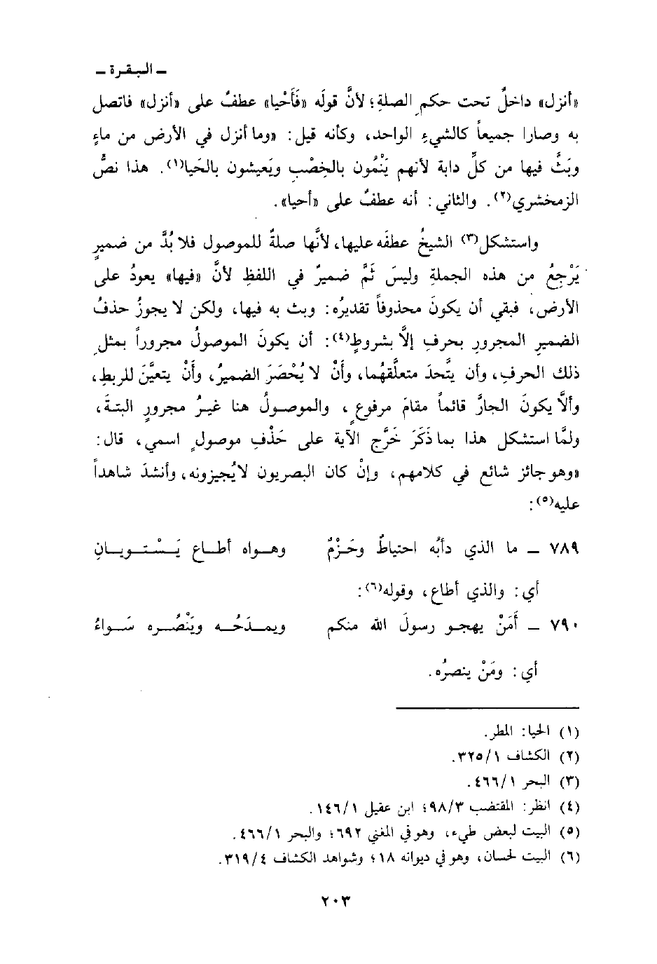 واستشكل الشيخُ عطفَه عليها، لأنَّها صلةٌ للموصول فلا بُدَّ من ضميرٍ يَرْجِعُ من هذه الجملةِ وليسَ ثَمَّ ضميرٌ في اللفظِ لأنَّ «فيها» يعودُ على الأرض، فبقي أن يكونَ محذوفاً تقديرُه: وبث به فيها، ولكن لا يجوزُ حذفُ الضمير المجرورِ بحرفِ إلاَّ بشروطٍ: أن يكونَ الموصولُ مجروراً بمثلِ ذلك الحرفِ، وأن يتَّحدَ متعلَّقهُما، وأَنْ لا يُحْصَرَ الضميرُ، وأَنْ يتعيَّنَ للربطِ، وألاَّ يكونَ الجارَّ قائماً مقامَ مرفوعٍ، والموصولُ هنا غيرُ مجرورٍ البتةَ، ولمَّا استشكل هذا بما ذَكَرَ خَرَّج الآية على حَذْفِ موصولٍ اسمي، قال: «وهو جائز شائع في كلامهم، وإنْ كان البصريون لا يُجيزونه، وأنشدَ شاهداً عليه: