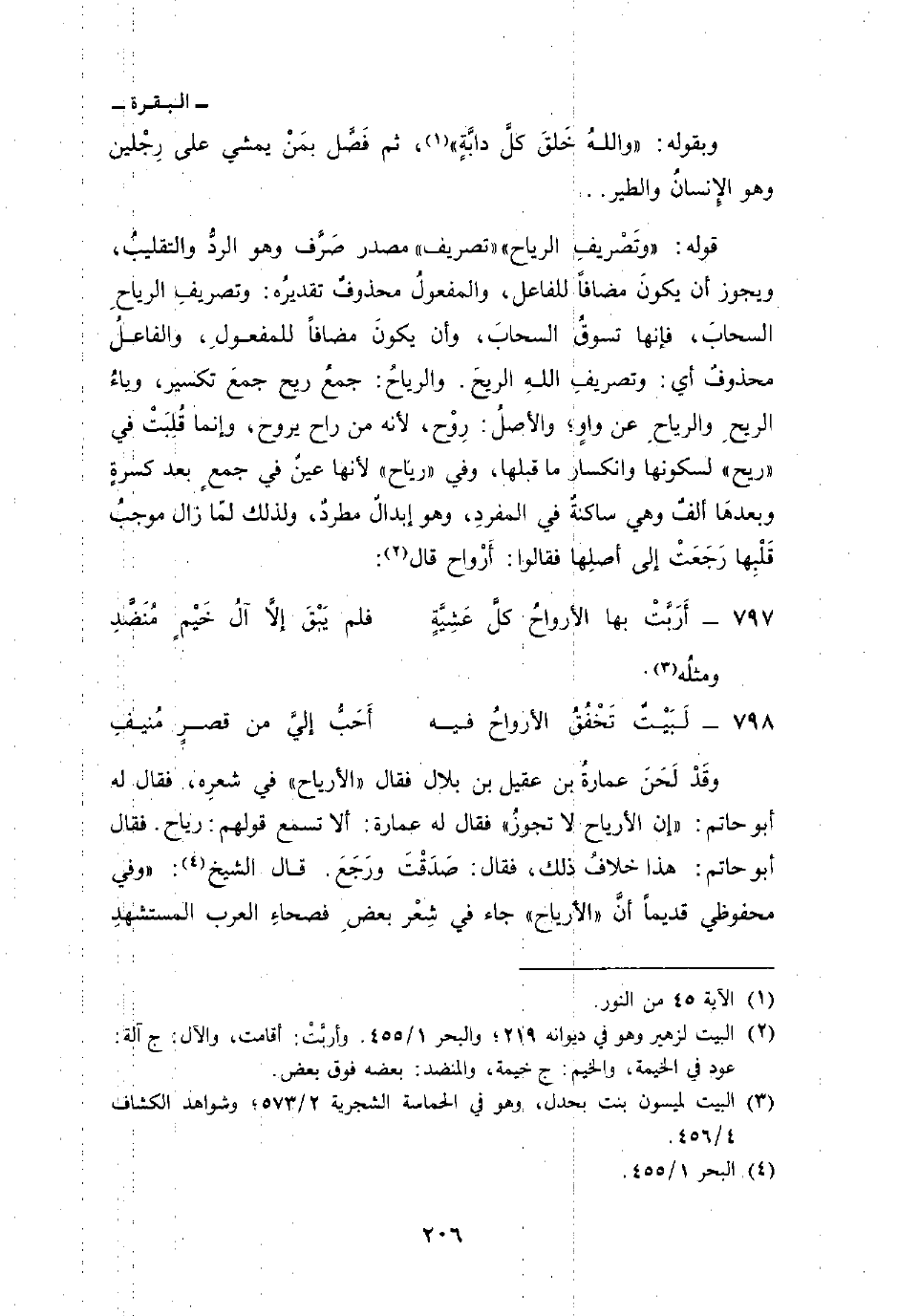 وقَدْ لَحَنَ عمارةُ بن عقيل بن بلال فقال» الأرياح «في شعرِه، فقال له أبو حاتم:» إن الأرياح لا تجوزُ «فقال له عمارة: ألا تسمع قولهم: رياح. فقال أبو حاتم: هذا خلافُ ذلك، فقال: صَدَقْتَ ورَجَعَ. قال الشيخ:» وفي محفوظي قديماً أنَّ «الأرياح» جاء في شِعْر بعضِ فصحاءِ العرب المستشهدِ