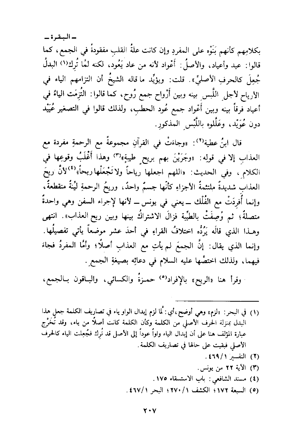 بكلامِهم كأنهم بَنَوْه على المفردِ وإن كانت علةُ القلبِ مفقودةً في الجمع، كما قالوا: عيد وأعياد، والأصلُ: أَعْواد لأنه من عاد يَعُود، لكنه لمَّا تُرِك البدلُ جُعِلَ كالحرفِ الأصليِّ «. قلت: ويؤيِّد ما قاله الشيخُ أن التزامهم الياء في الأرياح لأجلِ اللَّبسِ بينه وبي أَرْواح جمع رُوح، كما قالوا: التُزِمَت الياءُ في أعياد فرقاً بينه وبين أَعْواد جمع عُود الحطبِ، ولذلك قالوا في التصغير عُيَيْد دون عُوَيْد، وعَلَّلوه باللَّبْسِ المذكورِ.