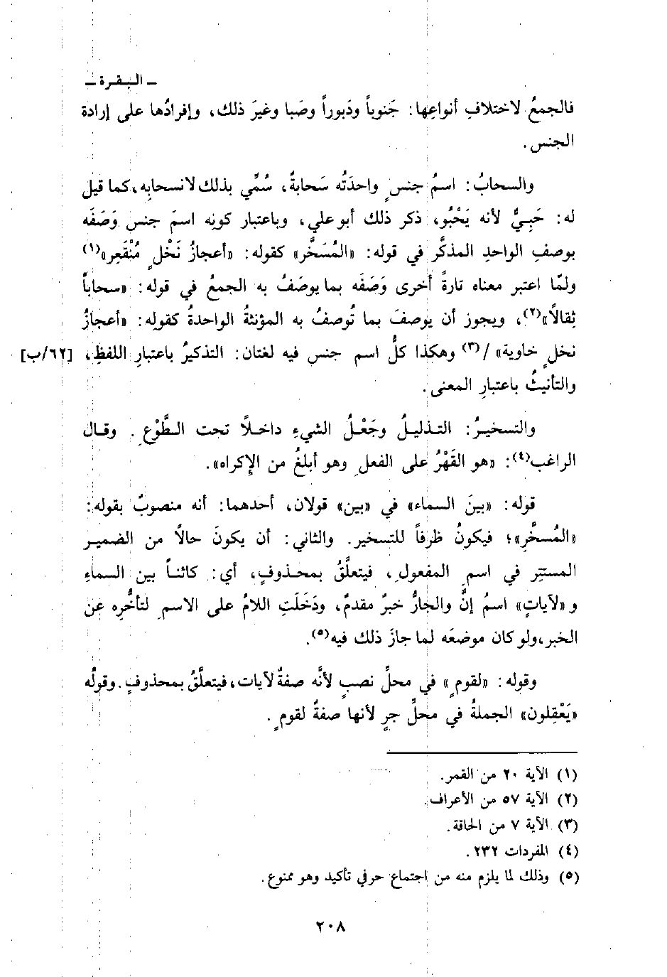 والسحابُ: اسمُ جنسٍ واحدَتُه سَحابةٌ، سُمِّي بذلك لانسحابِه، كما قيل له: حَبِيٌّ لأنه يَحْبُو، ذكر ذلك أبو علي، وباعتبار كونِه اسمَ جنس وَصَفَه بوصفِ الواحدِ المذكَّر في قوله: «المُسَخَّر» كقوله: {أَعْجَازُ نَخْلٍ مُّنقَعِرٍ} [القمر: 20] ولمّا اعتبر معناه تارةً أخرى وَصَفَه بما يوصَفُ به الجمعُ في قوله: {سَحَاباً ثِقَالاً} [الأعراف: 57] ، ويجوز أن يوصفَ بما تُوصفُ به المؤنثةُ الواحدةُ كقولِه: {أَعْجَازُ نَخْلٍ خَاوِيَةٍ} / [الحاقة: 7] وهكذا كلُّ اسم جنس فيه لغتان: التذكيرُ باعتبارِ اللفظِ والتأنيثُ باعتبارِ المعنى.