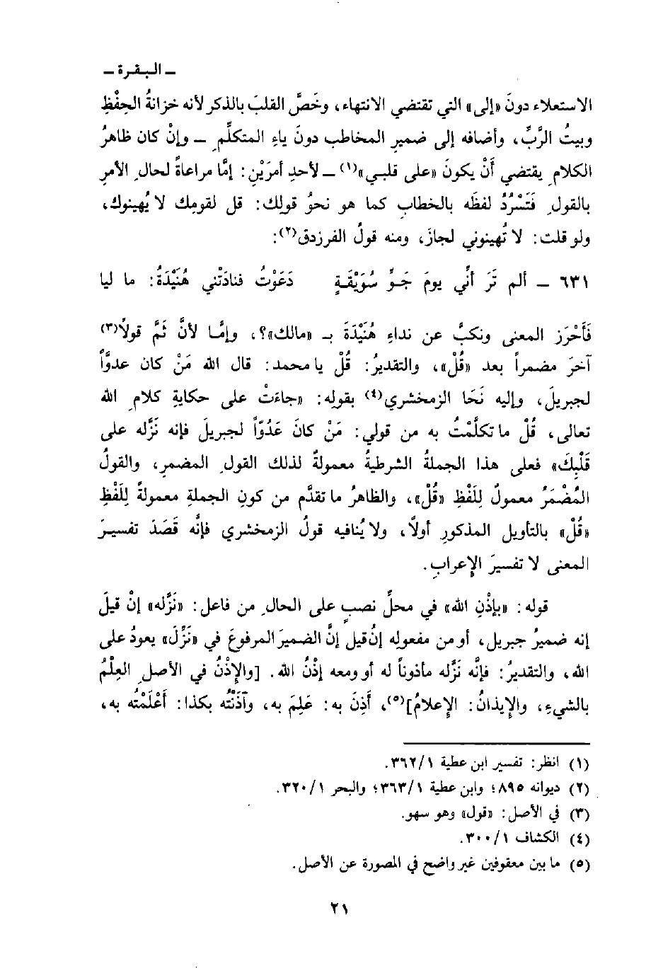 فَأَحْرَز المعنى ونكبَّ عن نداءِ هُنَيْدَةَ ب «مالك» ؟ ، وإمَّا لأنَّ ثَمَّ قولاً آخرَ مضمراً بعد «قُلْ» ، والتقديرُ: قُلْ يا محمد: قال الله مَنْ كان عدوَّاً لجبريلَ، وإليه نَحَا الزمخشري بقولِه: «جاءَتْ على حكايةِ كلامِ الله تعالى، قُلْ ما تكلَّمْتُ به من قولي: مَنْ كانَ عَدُوّاً لجبريلَ فإنه نَزَّله على قَلْبِكَ» فعلى هذا الجملةُ الشرطيةُ معمولةٌ لذلك القولِ المضمرِ، والقولُ المُضْمَرُ معمولٌ لِلَفْظِ «قُلْ» ، والظاهرُ ما تقدَّم من كونِ الجملةِ معمولةً لِلَفْظِ «قُلْ» بالتأويل المذكورِ أولاً، ولا يُنافيه قولُ الزمخشري فإنَّه قَصَدَ تفسيرَ المعنى لا تفسيرَ الإِعرابِ.
