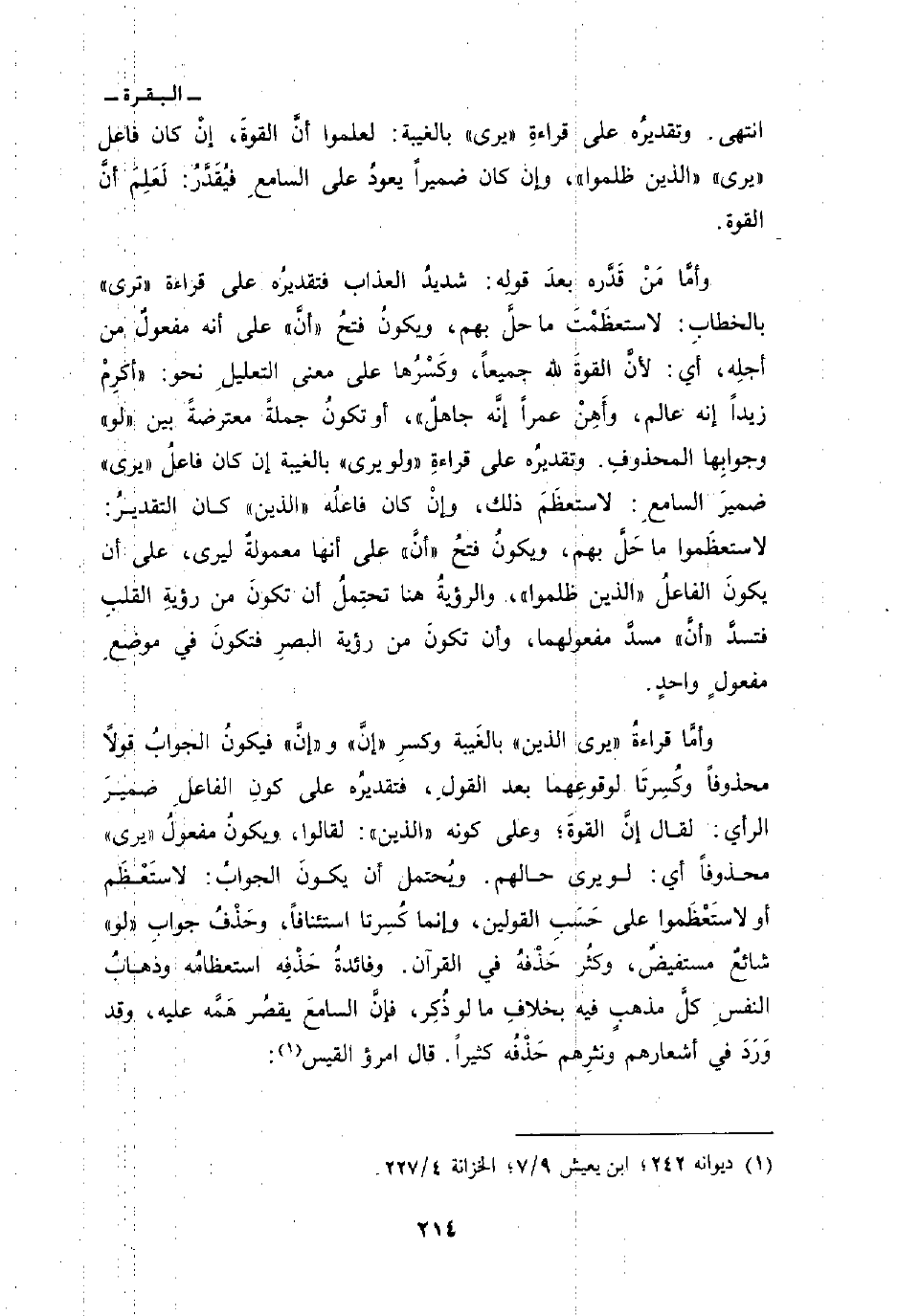وأمَّا قراءةُ «يرى الذين» بالغَيبة وكسرِ «إنَّ» و «إنَّ» فيكونُ الجوابُ قولاً محذوفاً وكُسِرتَا لوقوعِهما بعد القولِ، فتقديرُه على كونِ الفاعلِ ضميرَ الرأي: لقال إنَّ القوةَ؛ وعلى كونه «الذين» : لقالوا: ويكونُ مفعولُ «يرى» محذوفاً أي: لو يرى حالهم. ويُحتمل أن يكونَ الجوابُ: لاستَعْظَم أو لاستَعْظَموا على حَسَبِ القولين، وإنما كُسِرتا استئنافاً، وحَذْفُ جوابِ «لو» شائعٌ مستفيضٌ، وكثُر حَذْفهُ في القرآن. وفائدةُ حَذْفِه استعظامُه وذهابُ النفسِ كلَّ مذهبٍ فيه بخلافِ ما لو ذُكِر، فإنَّ السامعَ يقصُر هَمَّه عليه، وقد وَرَدَ في أشعارهم ونثرِهم حَذْفُه كثيراً. قال امرؤ القيس: