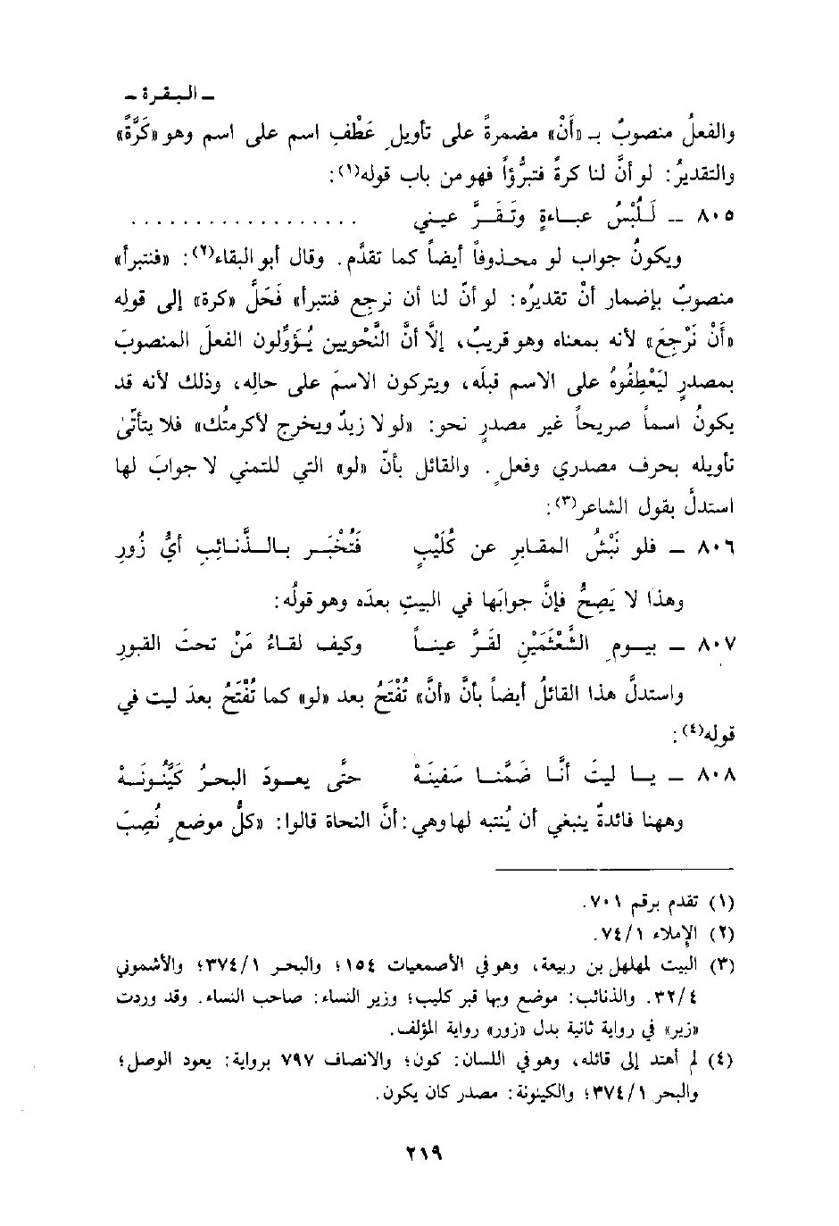 ويكونُ جواب لو محذوفاً أيضاً كما تقدَّم. وقال أبو البقاء:» فنتبرأ «منصوبٌ بإضمار أنْ تقديرُه: لو أنّ لنا أن نرجِع فنتبرأ» فَحَلَّ «كرة» إلى قولِه «أَنْ نَرْجِعَ» لأنه بمعناه وهو قريبٌ، إلاَّ أنَّ النَّحْويين يُؤَوِّلون الفعلَ المنصوبَ بمصدرٍ ليَعْطِفُوهُ على الاسم قبلَه، ويتركون الاسمَ على حالِه، وذلك لأنه قد يكونُ اسماً صريحاً غير مصدرٍ نحو: «لولا زيدٌ ويخرج لأكرمتُك» فلا يتأتّى تأويله بحرف مصدري وفعلٍ. والقائل بأنّ «لو» التي للتمني لا جوابَ لها استدلَّ بقول الشاعر: