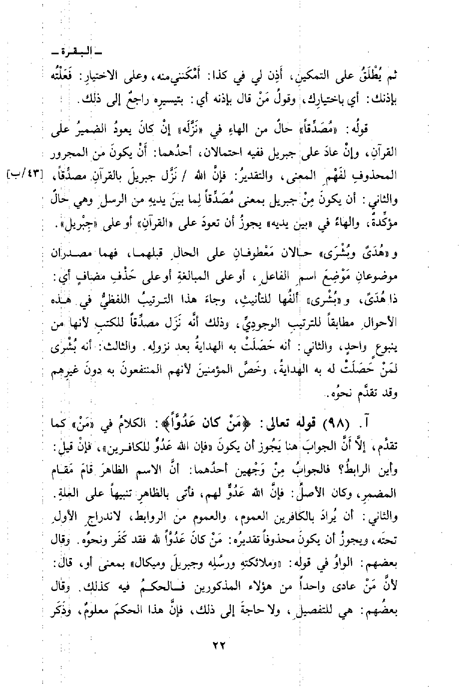 قولُه: «مُصَدِّقاً» حالٌ من الهاءِ في «نَزَّلَه» إنْ كانَ يعودُ الضميرُ على القرآنِ، وإنْ عادَ على جبريل ففيه احتمالان، أحدُهما: أَنْ يكونَ من المجرور المحذوفِ لفَهْمِ المعنى، والتقديرُ: فإنَّ الله / نَزَّل جبريلَ بالقرآنِ مصدِّقاً، والثاني: أن يكونَ مِنْ جبريل بمعنى مُصَدِّقاً لِما بينَ يديهِ من الرسلِ وهي حالٌ مؤكِّدةٌ، والهاءُ في «بين يديه» يجوزُ أن تعودَ على «القرآنِ» أو على «جِبْريل» .