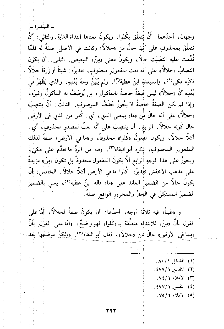 و «طيباً» فيه ثلاثة أوجه، أحدُها: أن يكونَ صفةً لحلالاً، أمَّا على القول بأنَّ «مِنْ» للابتداءِ متعلِّقة ب «كُلوا» فهو واضحُ، وأمّا على القولِ بأنّ «مِما في الأرض» حالٌ من «حلالاً» ، فقال أبو البقاء: «ولكنَّ موضعَها بعد