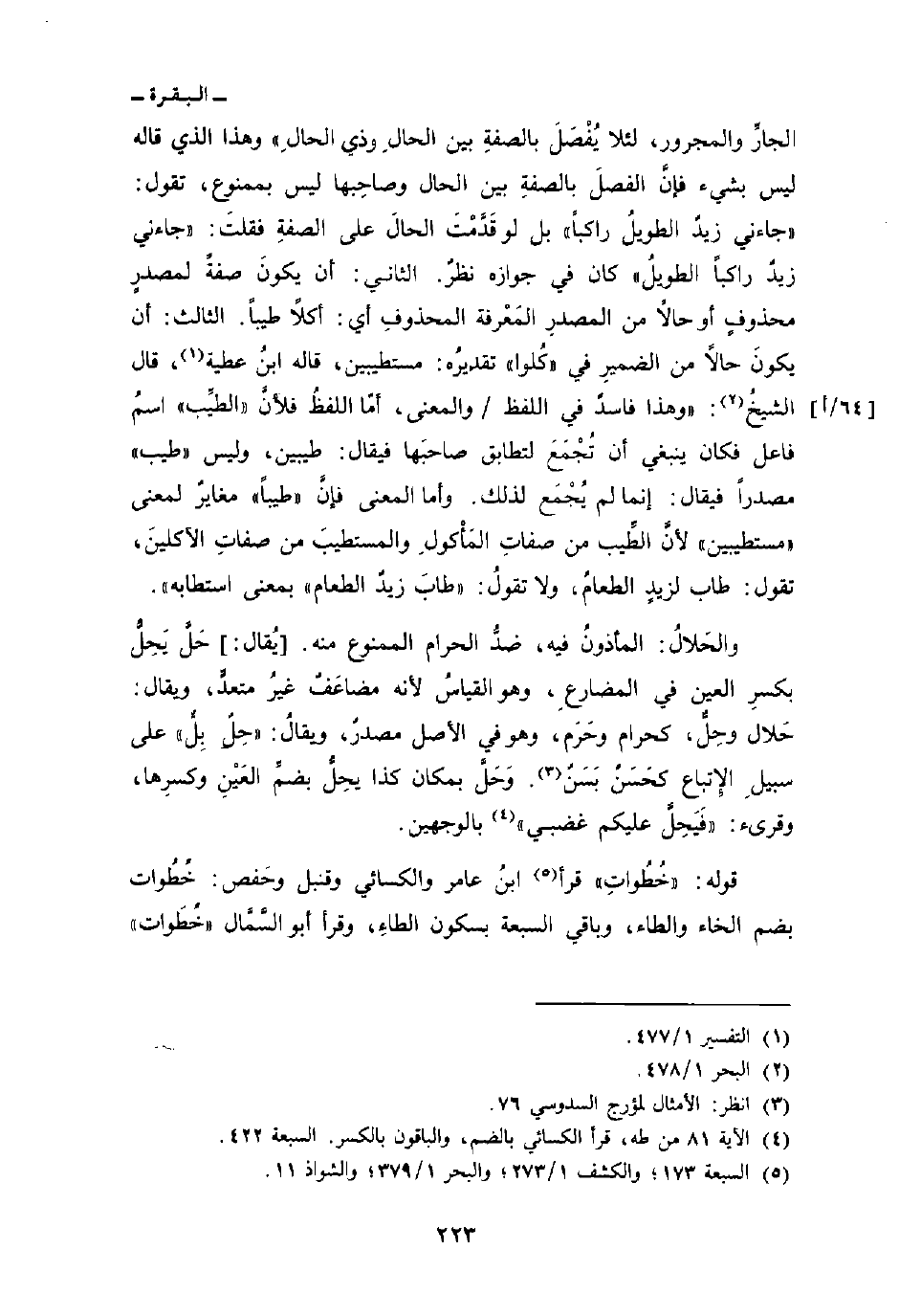 الجارِّ والمجرور، لئلا يُفْصَلَ بالصفةِ بين الحالِ وذي الحالِ» وهذا الذي قاله ليس بشيء فإنَّ الفصلَ بالصفةِ بين الحال وصاحِبها ليس بممنوع، تقول: «جاءني زيدٌ الطويلُ راكباً» بل لو قَدَّمْتَ الحالَ على الصفةِ فقلتَ: «جاءني زيدٌ راكباً الطويلُ» كان في جوازه نظرٌ. الثاني: أن يكونَ صفةً لمصدرٍ محذوفٍ أو حالاً من المصدرِ المَعْرفة المحذوفِ أي: أكلاً طيباً. الثالث: أن يكونَ حالاً من الضميرِ في «كُلوا» تقديرُه: مستطيبين، قاله ابنُ عطية، قال الشيخُ: «وهذا فاسدٌ في اللفظ/ والمعنى، أمّا اللفظُ فلأنَّ» الطيِّب «اسمُ فاعل فكان ينبغي أن تُجْمَعَ لتطابق صاحبَها فيقال: طيبين، وليس» طيب «مصدراً فيقال: إنما لم يُجْمَع لذلك.