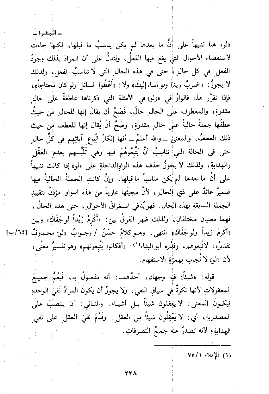 لو «هنا تنبيهاً على أنَّ ما بعدها لم يكن يناسبُ ما قبلها، لكنها جاءت لاستقصاء الأحوال التي يقع فيها الفعلُ، ولتدلُّ على أن المرادَ بذلك وجودُ الفعلِ في كل حالٍ، حتى في هذه الحالِ التي لا تناسبُ الفعلَ، ولذلك لا يجوزُ:» اضربْ زيداً ولو أساء إليكَ «ولا:» أَعْطُوا السائل ولو كان محتاجاً «، فإذا تقرَّر هذا فالواوُ في» ولو «في الأمثلةِ التي ذكرناها عاطفةٌ على حالٍ مقدرةٍ، والمعطوف على الحالِ حالٌ، فَصَحَّ أن يقالَ إنها للحالِ من حيثُ عطفُها جملةً حاليةً على حالٍ مقدرةٍ، وصَحَّ أن يقالَ إنها للعطف من حيث ذلك العطفُ، والمعنى - والله أعلمُ - أنها إنكارُ اتِّباعِ آبائِهِم في كلِّ حالٍ حتى في الحالة التي تناسِبُ أنْ يَتَّبِعُوهُمْ فيها وهي تَلَبُّسهم بعدمِ العَقْلِ والهدايةِ، ولذلك لا يجوزُ حذف هذه الواوِ الداخلةِ على» لو «إذا كانت تنبيهاً على أنَّ ما بعدها لم يكن مناسباً ما قبلها، وإنْ كانتِ الجملةُ الحاليةُ فيها ضميرٌ عائدٌ على ذي الحالِ، لأنَّ مجيئَها عاريةً من هذه الواو مؤذنٌ بتقييدِ الجملةِ السابقةِ بهذه الحال.