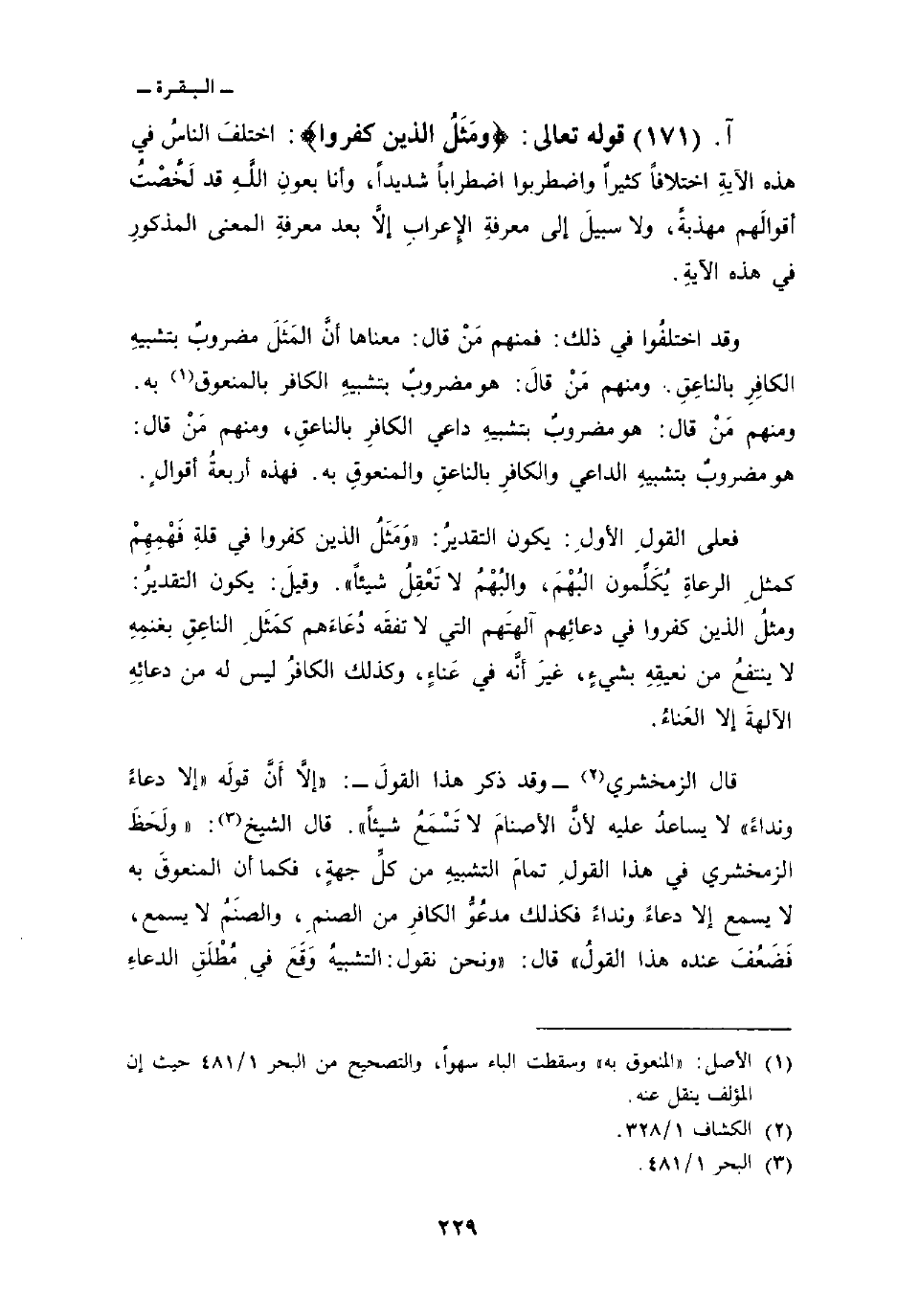 وقد اختلفُوا في ذلك: فمنهم مَنْ قال: معناها أنَّ المَثَلَ مضروبٌ بتشبيهِ الكافِرِ بالناعِقِ. ومنهم مَنْ قالَ: هو مضروبٌ بتشبيهِ الكافر بالمنعوق به. ومنهم مَنْ قال: هو مضروبٌ بتشبيهِ الداعي والكافرِ بالناعقِ والمنعوقِ به. فهذه أربعةُ أقوالٍ.