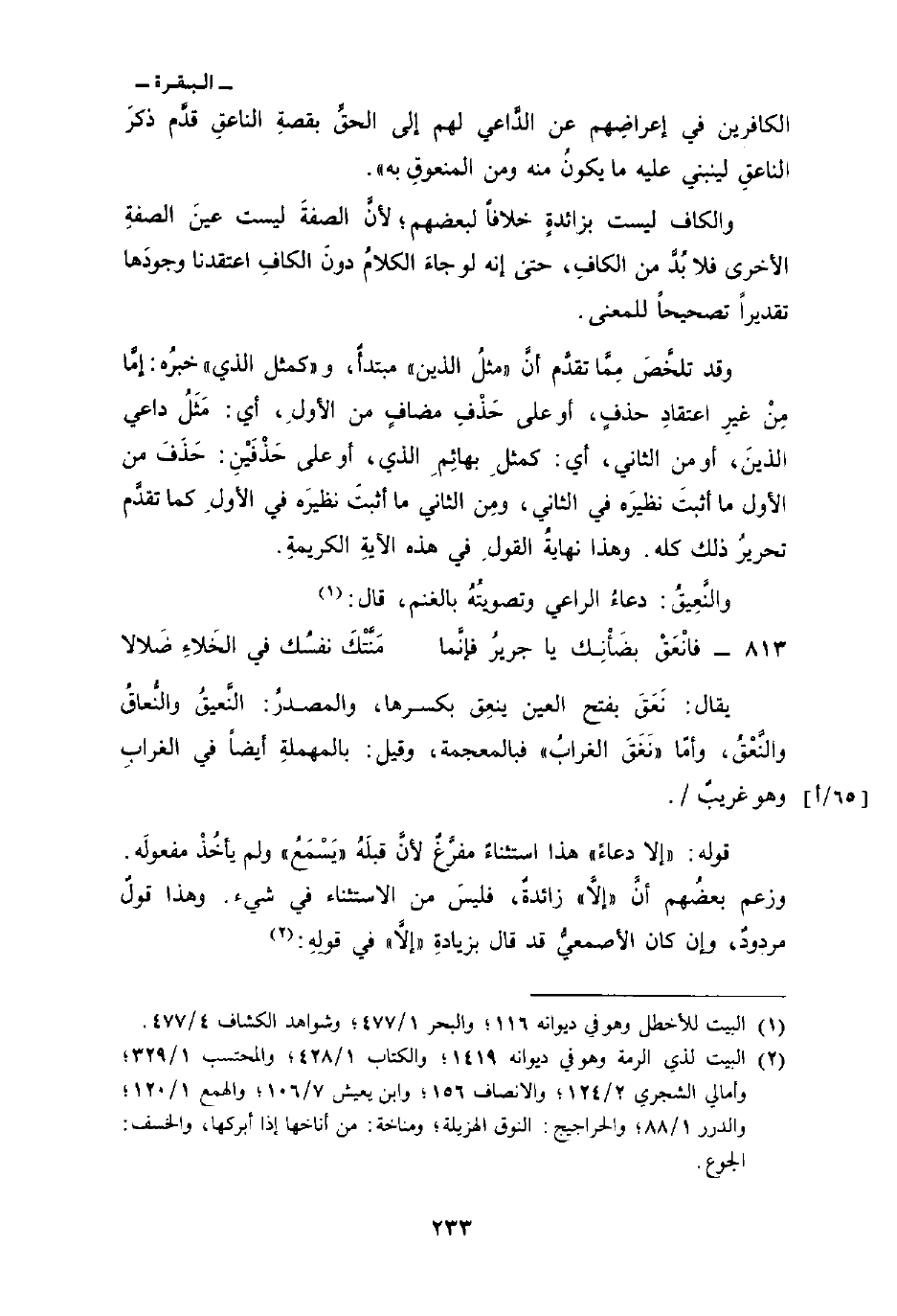 وقد تلخَّصَ مِمَّا تقدَّم أنَّ «مثلُ الذين» مبتدأٌ، و «كمثل الذي» خبرُه: إمَّا مِنْ غيرِ اعتقادِ حذفٍ، أو على حَذْفِ مضافٍ من الأولِ، أي: مَثَلُ داعي الذينَ، أو من الثاني: أي: كمثلِ بهائِمِ الذي، أو على حَذْفَيْنِ: حَذَفَ من الأول ما أثبتَ نظيرَه في الثاني، ومِن الثاني ما أثبتَ نظيرَه في الأولِ كما تقدَّم تحريرُ ذلك كله. وهذا نهايةٌ القولِ في هذه الآيةِ الكريمةِ.
