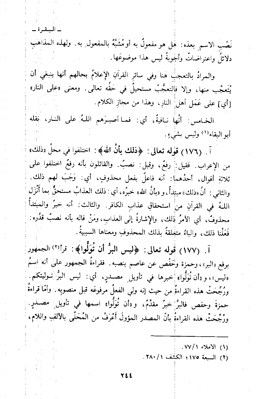 قوله تعالى: {ذَلِكَ بِأَنَّ الله} : قرأ الجمهور برفع «البر» ، وحمزة وحَفْص عن عاصم بنصبه. فقراءةٌ الجمهور على أنه اسمُ «ليس» ، و «أن تُوَلُّوا» خبرها في تأويلِ مصدرٍ، أي: ليس البرُّ توليتكم. ورُجِّحَتْ هذه القراءةُ من حيث إنه ولي الفعلُ مرفوعَه قبل منصوبِه. وأمّا قراءةُ حمزةَ وحفص فالبرَّ خبرٌ مقدَّمٌ، و «أن تُوَلُّوا» اسمها في تأويلِ مصدرٍ. ورُجِّحَتْ هذه القراءةُ بأنّ المصدر المؤولَ أَعْرَفُ من المُحَلّى بالألفِ واللام،
