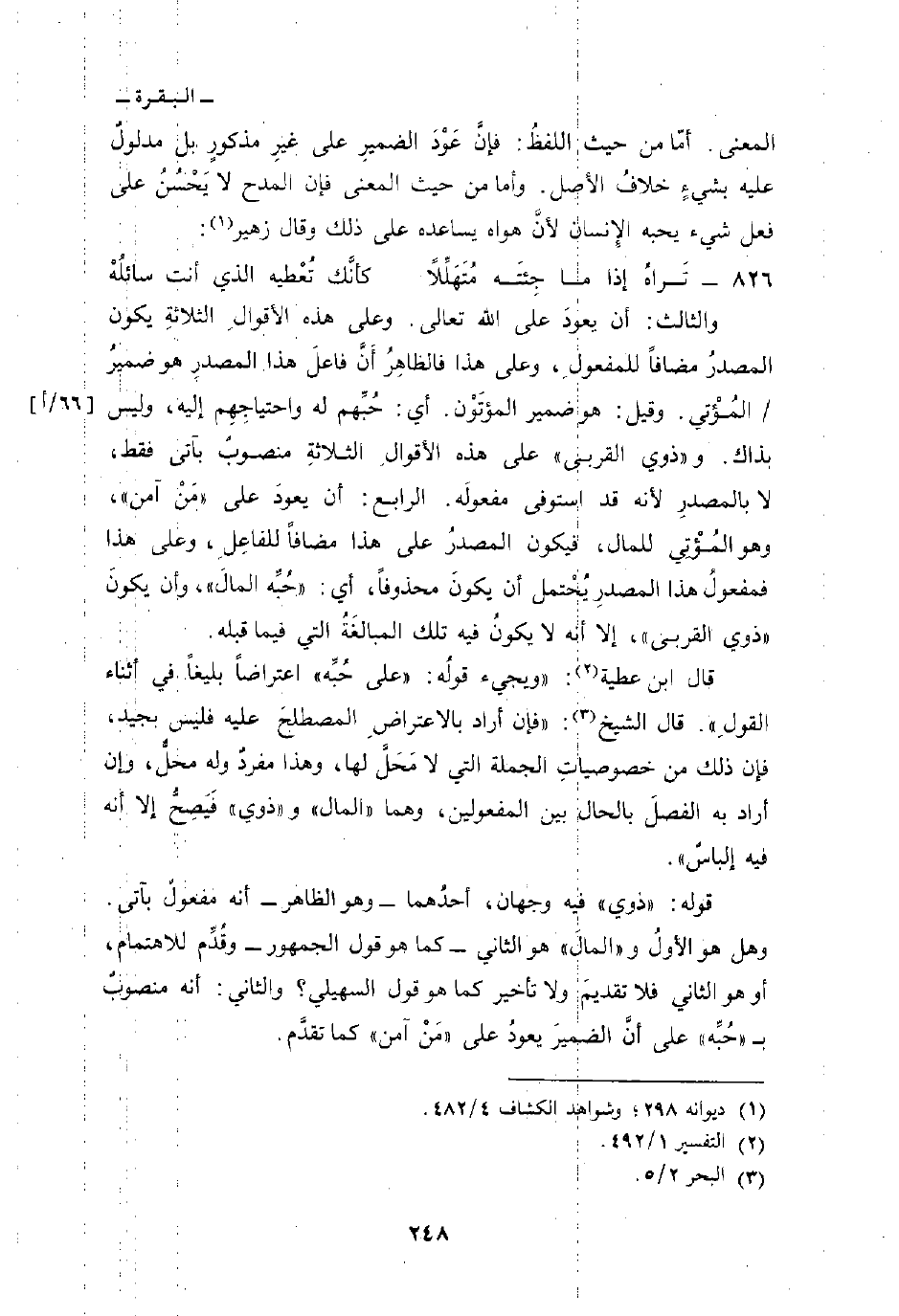 و «ذي القربى» على هذه الأقوالِ الثلاثةِ منصوبٌ بآتى فقط، لا بالمصدرِ لأنه قد استوفى مفعولَه. الرابع: أن يعودَ على «مَنْ آمن» ، وهو المُؤْتِي للمال، فيكون المصدرُ على هذا مضافاً للفاعِلِ، وعلى هذا فمفعولُ هذا المصدرِ يُحْتمل أن يكونَ محذوفاً، أي: «حُبِّه المال» ، وأن يكونَ «ذوي القربى» ، إلا أنه لا يكونُ فيه تلك المبالغَةُ التي فيما قبله.
