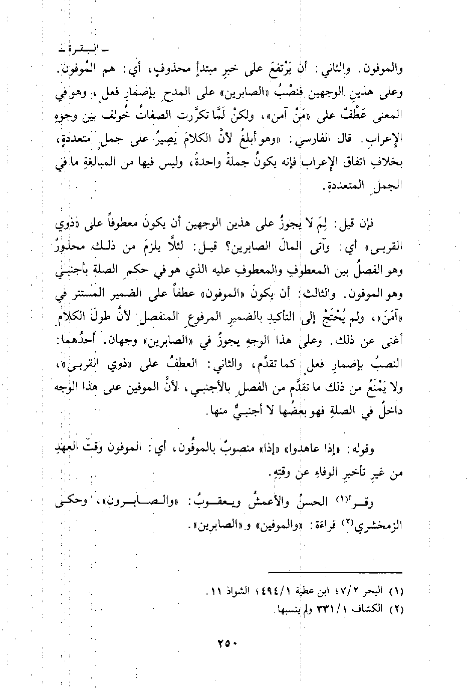 والموفون. والثاني: أن يَرْتفعَ على خبرِ مبتدأٍ محذوفٍ، أي: هم المُوفون. وعلى هذينِ الوجهين فنصْبُ «الصابرين» على المدحِ بإضمارِ فعلٍ، وهو في المعنى عَطْفٌ على «مَنْ آمن» ، ولكنْ لَمَّا تكرَّرت الصفاتُ خُولف بين وجوه الإِعرابِ.