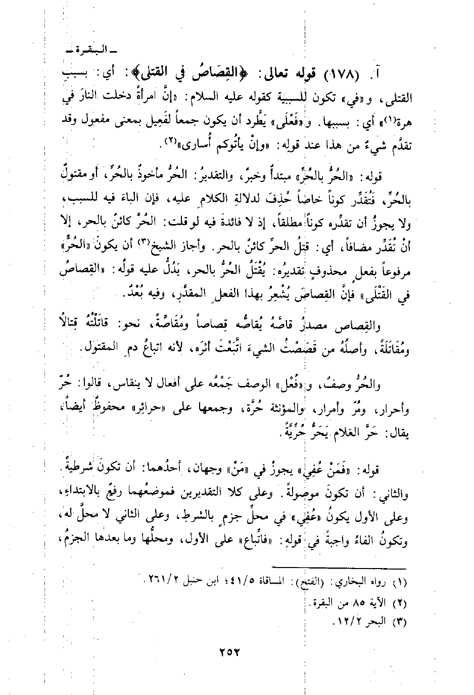 قوله تعالى: {القصاص فِي القتلى} : أي: بسببِ القتلى، و «في» تكون للسببية كقوله عليه السلام: «إنَّ امرأة دخلت النارَ في هرة» أي: بسببها. و «فَعْلَى» يَطَّرد أن يكون جمعاً لفَعِيل بمعنى مفعول وقد تقدَّم شيءٌ من هذا عند قولِه: {وَإِن يَأتُوكُمْ أسارى} [البقرة: 85] .