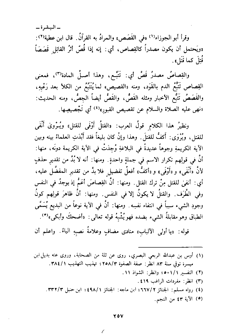 ونظيرُ هذا الكلامِ قولُ العرب: «القتلُ أَوْفَى للقتل» ويُرْوى أَنْفَى للقتل، ويُرْوَى: أَكفُّ للقتَل. وهذا وإنْ كان بليغاً فقد أَبْدَتِ العلماءُ بينه وبين الآية الكريمةِ وجوهاً عديدةً في البلاغةِ وُجِدَتْ في الآية الكريمة دونَه، منها: أنَّ في قولِهم تكرار الاسم في جملةٍ واحدةٍ. ومنها: أنه لا بُدَّ من تقديرِ حذفٍ لأنَّ «أَنْفَى» وأَوْفَى «و» أكفُّ «أفعلُ تفضيلٍ فلا بدَّ من تقديرِ المفضَّل عليه، أي: أنفى للقتل مِنْ ترك القتل. ومنها: أنَّ القِصاصَ أَمُّ إذ يوجدُ في النفس وفي الطَّرَف. والقتلُ لا يكونُ إلا في النفس. ومنها: أنَّ ظاهرَ قولِهم كونُ وجودِ الشيء سبباً في انتفاء نفسِه. ومنها: أنَّ في الآية نوعاً من البديع يُسَمَّى الطباق وهو مقابلةُ الشيء بضده فهو يُشْبِهُ قوله تعالى: {أَضْحَكَ وأبكى} [النجم: 43] قوله: {ياأولي الألباب} منادى مضافٍ وعلامةُ نصبِهِ الياءُ. واعلم أن»