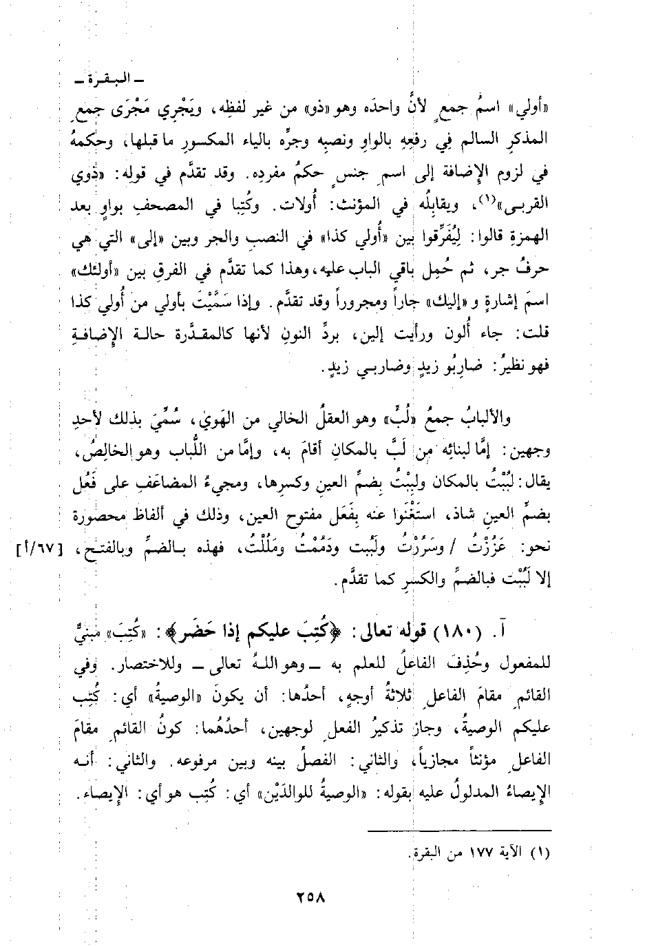 أولي «اسمُ جمعٍ لأنَّ واحدَه وهو» ذو «من غير لفظِه. ويَجْرِي مَجْرَى جمعِ المذكرِ السالم فِي رفعِهِ بالواوِ ونصبِه وجرِّه بالياء المكسورِ ما قبلها، وحكمهُ في لزوم الإِضافة إلى اسمِ جنسٍ حكمُ مفردِه. وقد تقدَّم في قولِه: {ذَوِي القربى} [البقرة: 177] ويقابِلُه في المؤنث: أُولات: وكُتِبا في المصحفِ بواوٍ بعد الهمزةِ قالوا: لِيُفَرِّقوا بين» أُولي كذا «في النصبِ والجر وبين» إلى «التي هي حرفُ جر، ثم حُمِل باقي الباب عليه، وهذا كما تقدَّم في الفرقِ بين» أولئك «اسمَ إشارةٍ و» إليك «جاراً ومجروراً وقد تقدَّم. وإذا سَمَّيْتَ بأولي من أُولي كذا قلت: جاء أُلون ورأيت إلين، بردِّ النونِ لأنها كالمقدَّرة حالة الإِضافةِ فهو نظيرُ: ضارِبُو زيدٍ وضاربي زيدٍ.
