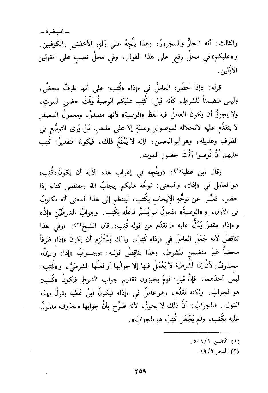 وقال ابن عطية: «ويتَّجِه في إعرابِ هذه الآية أن يكونَ» كُتِب «هو العامل في» إذا «، والمعنى: توجَّه عليكم إيجابُ الله ومقتضى كتابه إذا حضر، فعبَّر عن توجُّهِ الإِيجابِ بكُتب، لينتظم إلى هذا المعنى أنه مكتوبٌ في الأزل، و» الوصيةُ «مفعولٌ لم يُسَمَّ فاعلُه بكُتِب. وجوابُ الشرطَيْنِ» إنْ «و» إذا «مقدرٌ يَدُلُّ عليه ما تقدَّم من قوله كُتِب» . قال الشيخ: «وفي هذا تناقضٌ لأنه جَعَلَ العاملَ في» إذا «كُتِبَ، وذلك يَسْتَلْزم أن يكونَ» إذا «ظرفاً محضاً غيرَ متضمنٍ للشرطِ، وهذا يناقِضُ قوله:» وجوابُ «إذا» و «إنْ» محذوفٌ؛ لأنَّ إذا الشرطيةَ لا يَعْمَلُ فيها إلا جوابُها أو فعلُها الشرطِيُّ، و «كُتِب» ليس أحدَهما، فإنْ قيل: قومٌ يجيزون تقديم جوابِ الشرطِ فيكونُ «كُتب» هو الجوابَ، ولكنه تقدَّم، وهو عاملٌ في «إذا» فيكونُ ابنُ عُطية يقولُ بهذا القولِ. فالجوابُ: أنَّ ذلك لا يجوزُ، لأنه صَرَّح بأنَّ جوابَها محذوف مدلولٌ عليه بكُتب، ولم يَجْعَل كُتِبَ هو الجوابَ «.